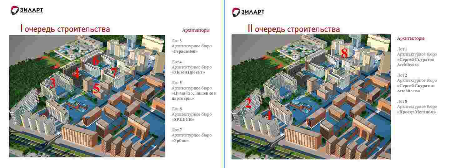Проектировщиками зданий первой очереди ЖК «ЗИЛАРТ» в рамках единого дизайн-кода выступили 10 ведущих архитектурных бюро России и мира. Каждый дом, проектируемый одним архитектором, это шедевр, продуманный до мелочей, со своей идеей и лицом. При их создании учитывались особенности места, где он строится, куда обращены фасады и как дом будет смотреться с разных точек обзора.