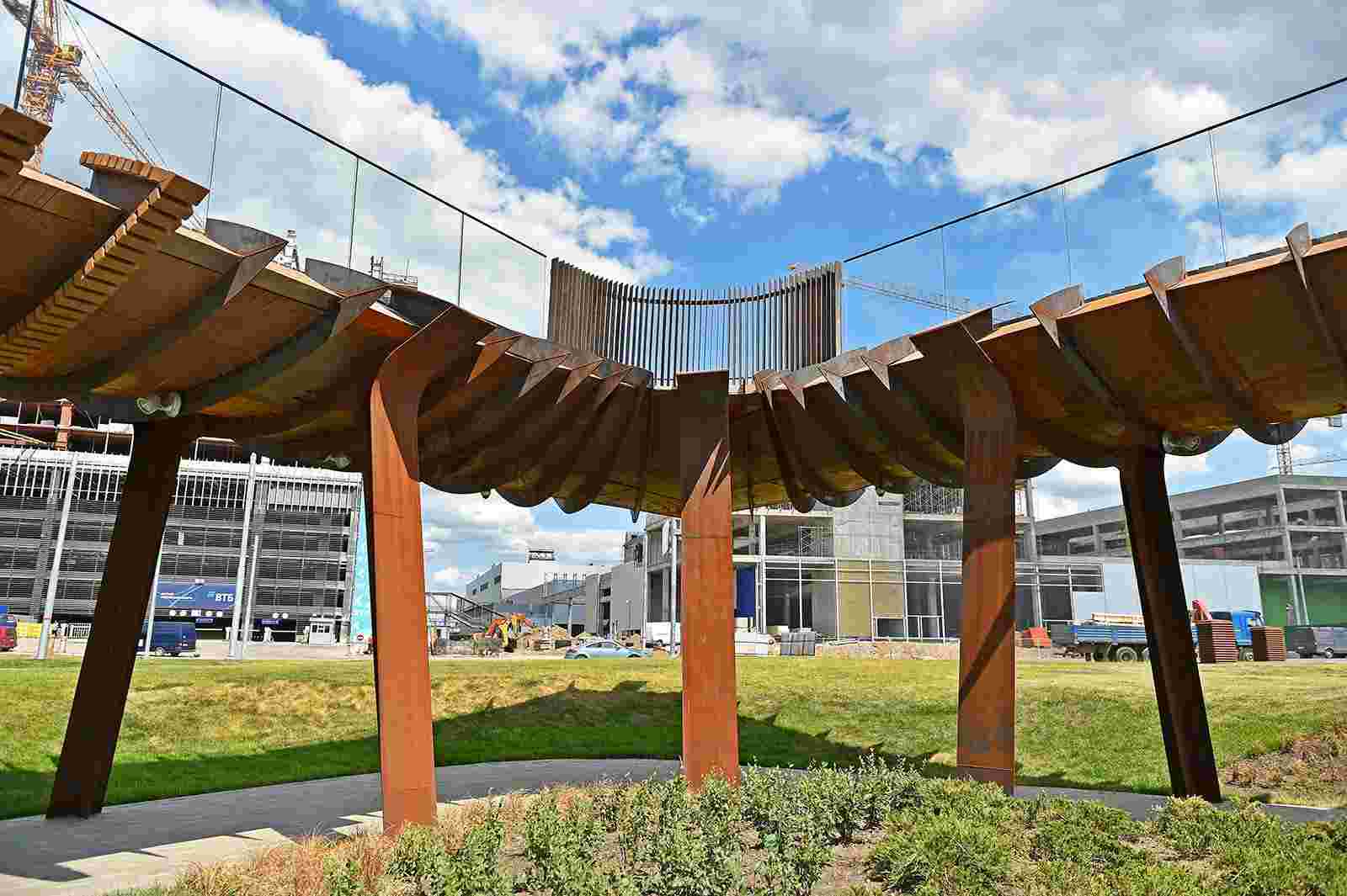 Сам дизайнер назвал ее caterpillar (гусеница). Она напоминает конвейерную цепь и отсылает к производственному прошлому территории. Пергола изготовлена из «вечной» кортеновской стали. Заржавев, материал навсегда сохраняет благородный терракотовый цвет.