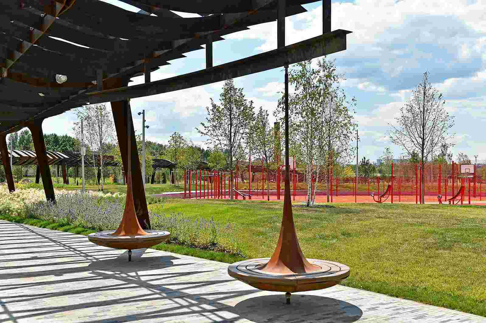 Под навесом можно будет укрыться от дождя и солнца или посидеть на вращающихся скамейках, похожих на юлу.