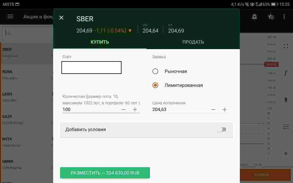 Выбираете финансовый инструмент, который хотите приобрести и далее выставляете заявку. Устанавливаете цену и количество. Заявка моментально попадает на биржу: