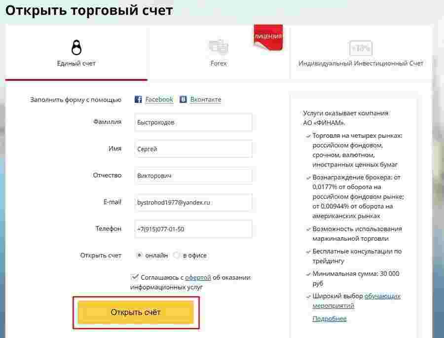 Форма регистрации у брокера выглядит так:
