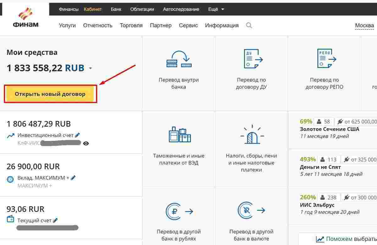 Открыть брокерский счёт в личном кабинете можно в ЛК, нажав на ссылку «Открыть новый договор»: