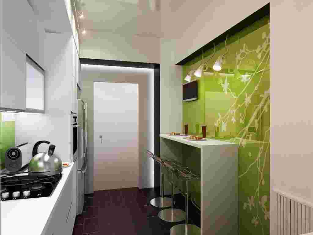 В самом конце полученной линии можно сделать зону для приема пищи. Самой лучшей альтернативой обеденного стола станет столешница, которую можно выдвинуть. Обычно такой предмет идет в комплекте со стульями раскладного типа. В некоторых случаях между обеденной и рабочей зонами остается менее 1 метра, поэтому стандартный стол необходимо заменить откидным или трансформером.