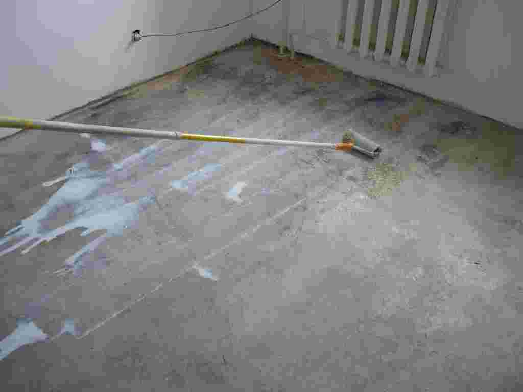 - затем пол нужно обработать грунтовкой, которая улучшает адгезию, укрепляет бетонную поверхность, а также предотвращает возникновения грибка. Жидкость наносится тонким слоем кистью или малярным валиком. После просыхания поверхности процедуру нужно повторить;