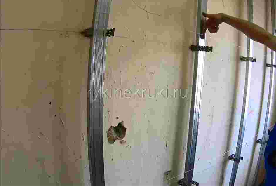 - Вертикально по всей длине конструкции размещают стоечные профили. Для этого сначала делают отступ от прилегающей стены на 55 см, потом размещают первый профиль, а следующие за ним уже с шагом в 60 см;