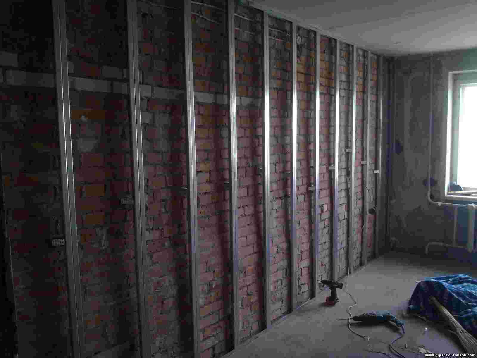 Практически всегда возникает спор, что делать с неровной стеной — оштукатурить её или проще построить каркас из металлических профилей и в последующем зашить регипсом и зашпаклевать. Если в споре победила обрешётка, то работа предстоит следующая: