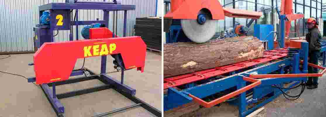 Колеса расположены на подвижной раме и вращаются в одном направлении за счет энергии двигателя. На них натянуто полотно пилы, которое движется вместе с ними в горизонтальной плоскости. На станине закреплены направляющие, на которых располагается бревно.