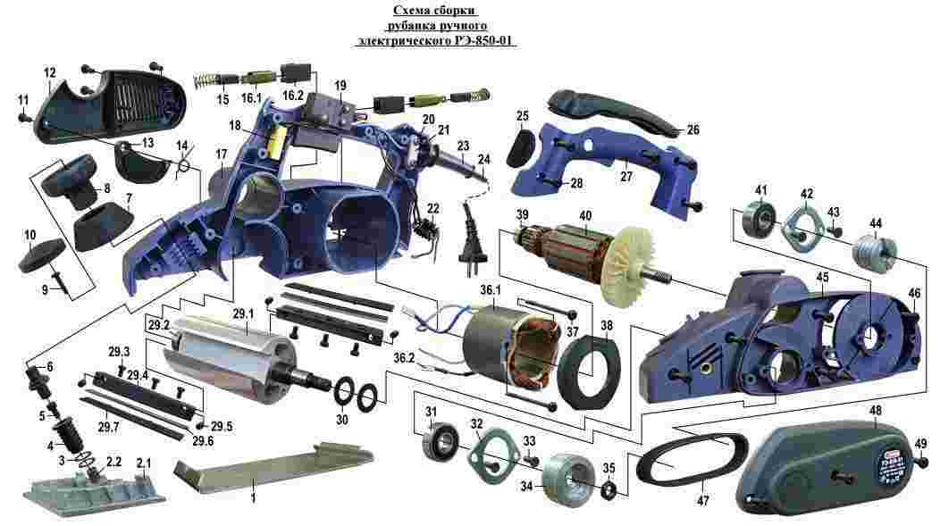 Современный ручной электрический рубанок состоит из ряда деталей и узлов.