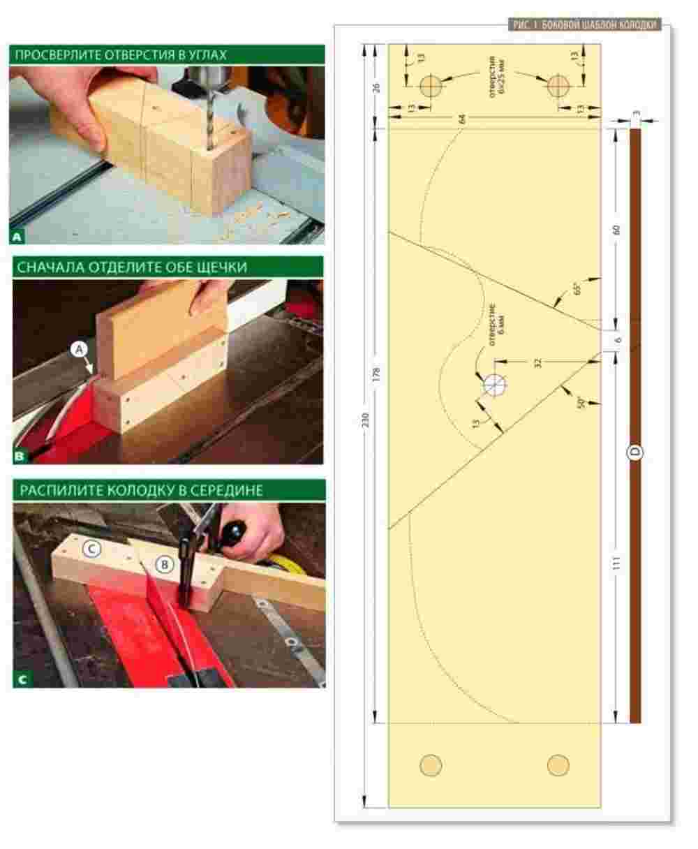 Колодка вырезается из твердых пород дерева. Ее заготовка должна превосходить по размеру готовое изделие на 40–50 мм. На боковые грани наносятся вертикальные и косые линии с продлением на остальные стороны. На сверлильном станке по центру заготовки формируется отверстие диаметром 6 мм, затем просверливаются такие же отверстия (4 шт.) с обеих сторон в углах. От заготовки отпиливаются «щечки», затем наносится разметка на место среза.