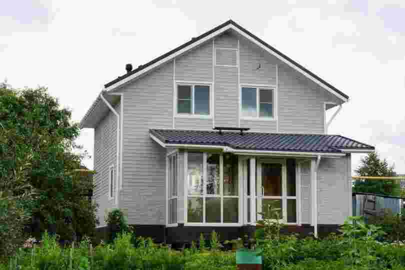 ΠΠ΅ΡΠ΅Π΄ΠΊΠΎ Π΄ΠΎΠΌΠ° ΠΎΡΠ΄Π΅Π»ΡΠ²Π°ΡΡΡΡ ΠΌΠ΅ΡΠ°Π»Π»ΠΈΡΠ΅ΡΠΊΠΈΠΌ ΡΠ°ΠΉΠ΄ΠΈΠ½Π³ΠΎΠΌ ΡΠ°Π·Π½ΡΡ ΡΠ²Π΅ΡΠΎΠ². ΠΠ°ΠΏΡΠΈΠΌΠ΅Ρ, Π½Π° ΠΎΠ΄Π½ΠΎΠΉ ΠΏΠΎΡΡΡΠΎΠΉΠΊΠ΅ Π²ΡΠ΅ ΡΡΠ΅Π½Ρ ΠΌΠΎΠ³ΡΡ Π±ΡΡΡ ΠΎΠ±ΡΠΈΡΡ Π±Π΅Π»ΡΠΌΠΈ, Π° ΡΠ³Π»Ρ β ΡΠ΅ΠΌΠ½ΠΎ-ΠΊΠΎΡΠΈΡΠ½Π΅Π²ΡΠΌΠΈ ΠΈΠ»ΠΈ Π±ΠΎΡΠ΄ΠΎΠ²ΡΠΌΠΈ ΠΏΠ°Π½Π΅Π»ΡΠΌΠΈ.