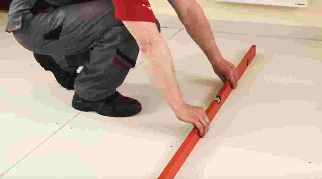 - при отсутствии возможности сделать это самовыравнивающейся смесью или путём монтажа наливных полов;