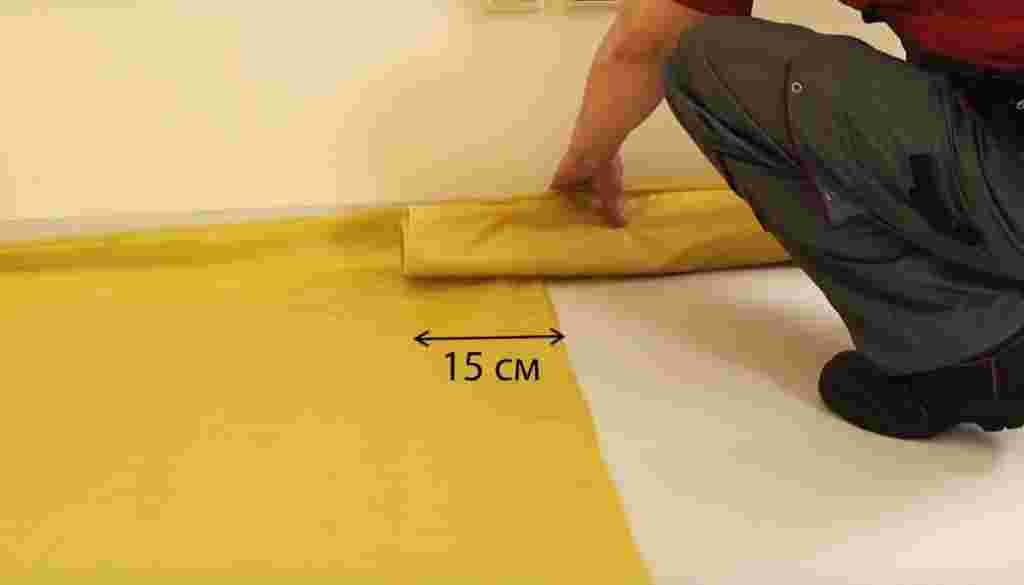Шаг 2. Чтобы пол был защищен от влаги, он застилается пароизоляционной пленкой. Материал обязательно подворачивается на стены на высоту плинтуса. Излишки у стен обрезаются.