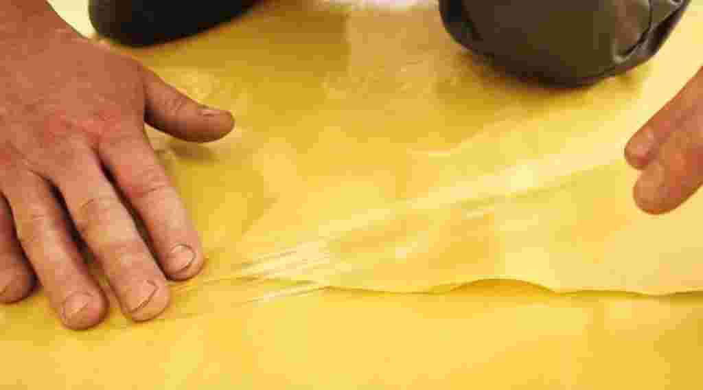 - Заботимся о том, как сделать гидроизоляцию пола в квартире. Накрываем поверхность пластиковой плёнкой. Стыки скрепляем монтажным скотчем.