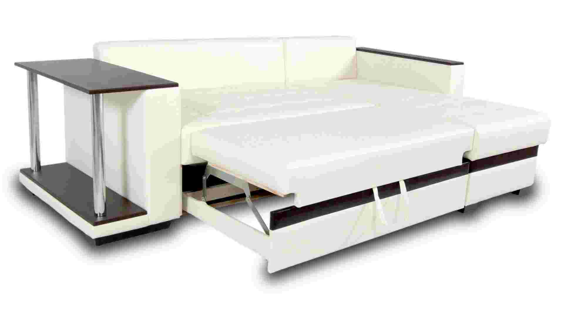 Встроенный боковой столик и широкий подлокотник с другой стороны позволяют с комфортом разместить все необходимые вещи, будь то ноутбук или чашка горячего кофе. А угол его можно менять, в зависимости от планировки комнаты. В собранном виде этот предмет мебели имеет длину чуть больше 2,5 м, а разложенный – превращается в удобную двуспальную кровать.