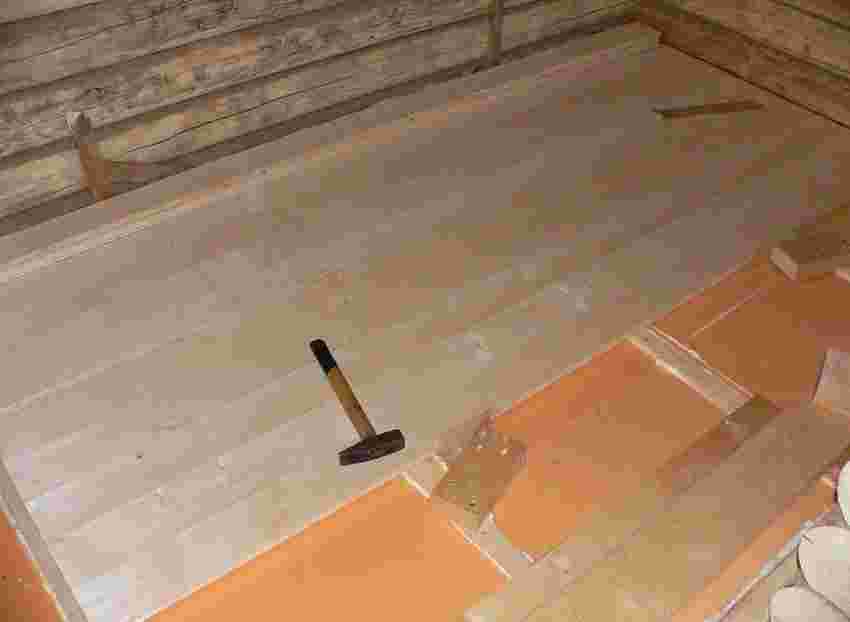 Чтобы создать нишу для укладки утеплителя, снизу по балкам набивают доски или листовой материал. Перед этим для обеспечения гидроизоляции утепляющего слоя из минваты или пенопласта основу обшивают пленкой. Влагозащитный ресурс укладывается полосами поперек лагов с перехлестом периметра не менее 10 см, швы надежно закрепляются скотчем.
