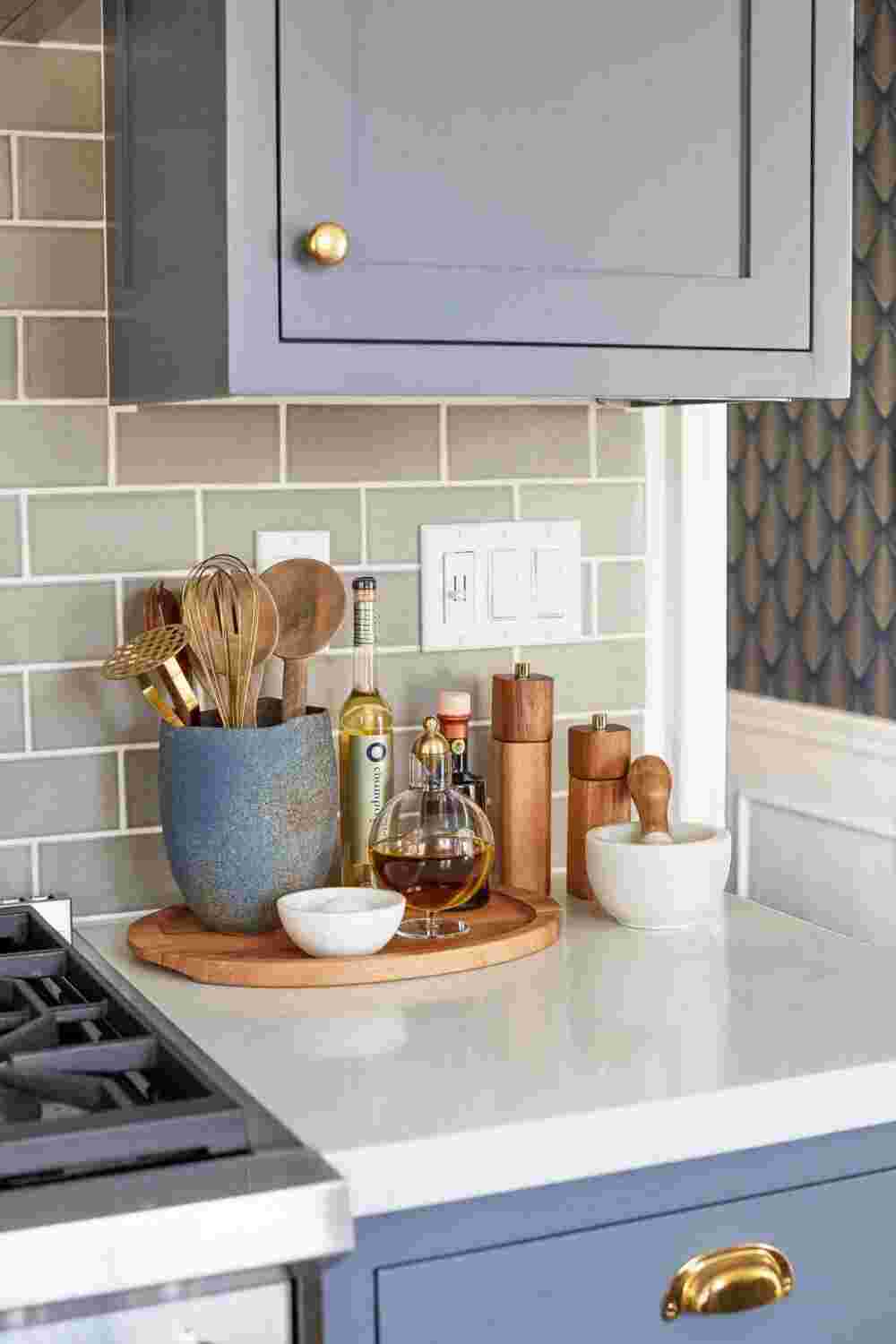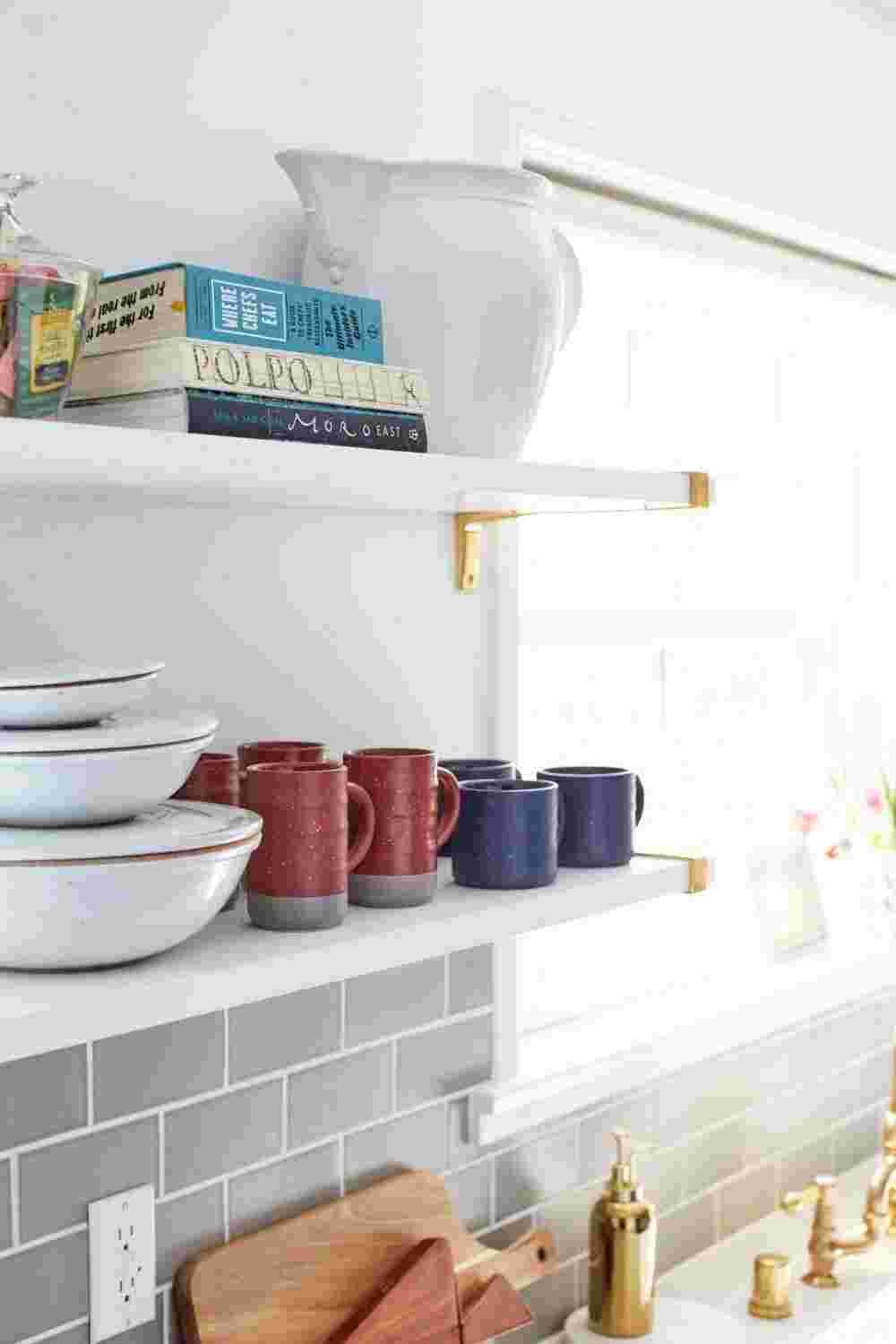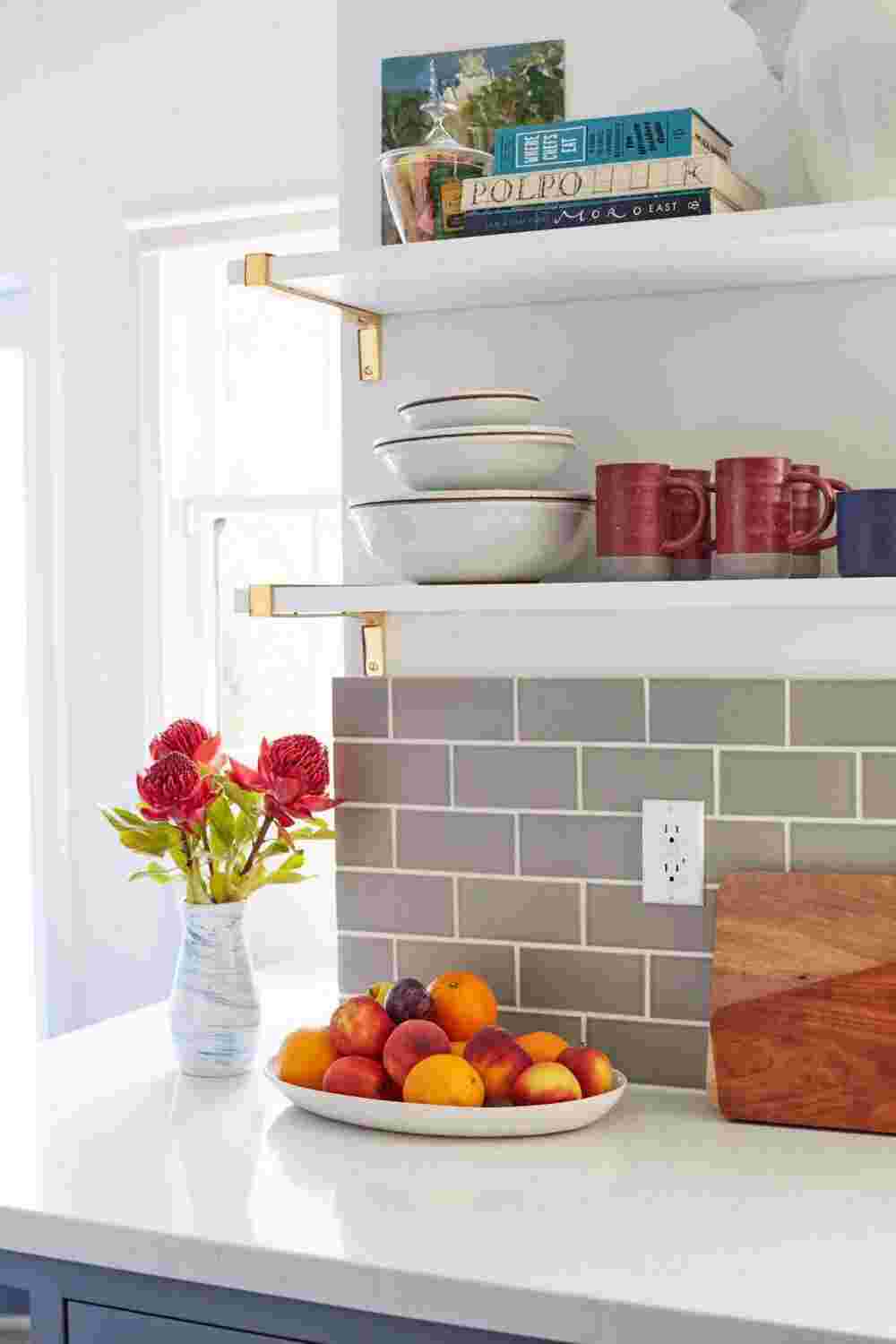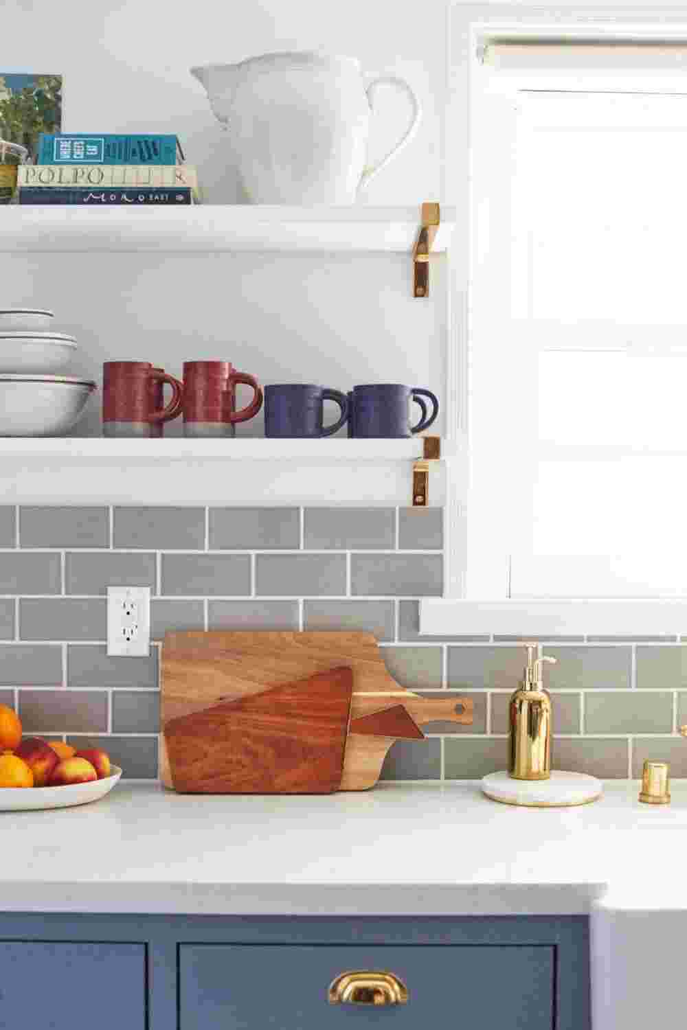 Если у вас есть слишком много предметов, загромождающих столешницы, рассмотрите умные решения, такие как настенные магнитные ножевые ленты, рельсы для подвешивания посуды, кастрюль, кружек, банок для специй и ящиков для столовых приборов. Также подумайте о том, что вам нужно иметь под рукой каждый день, например, разделочные доски, деревянные ложки, жидкость для мытья посуды, и что можно хранить до тех пор, пока это необходимо.