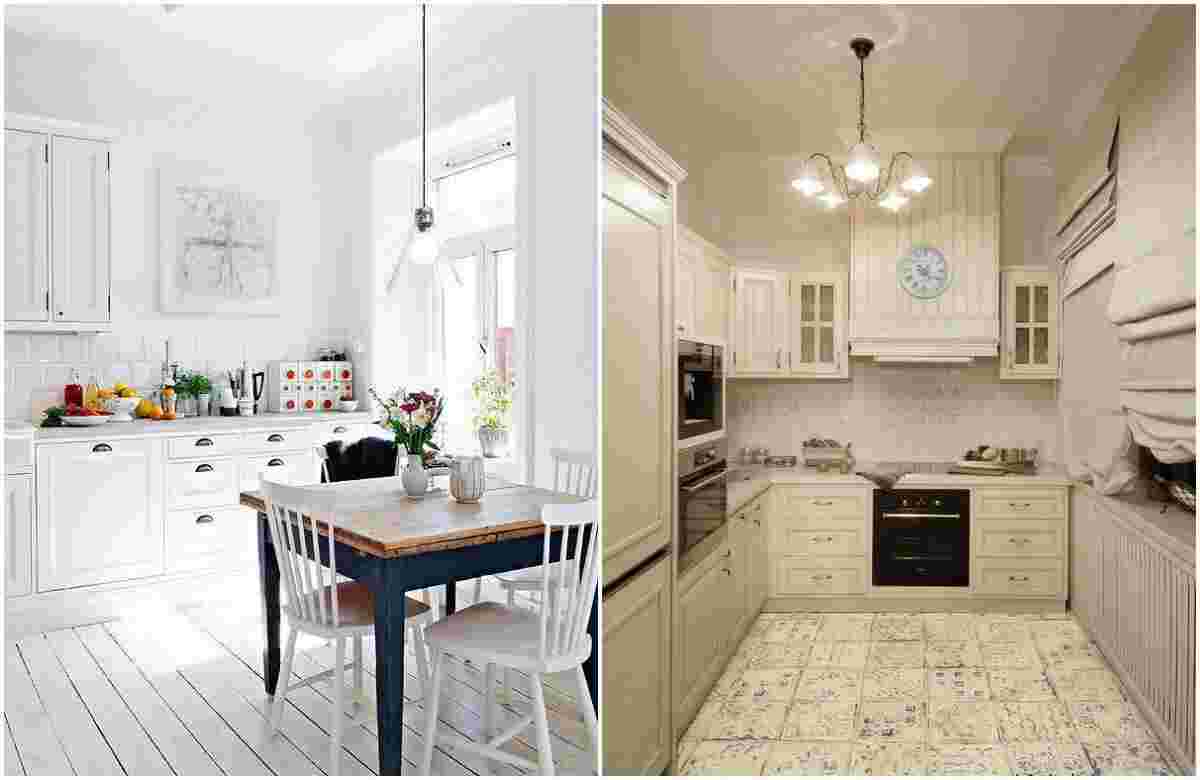 На малогабаритной кухне светлые тона должны преобладать во всем — это касается и мебели, и потолка, и стен, и даже пола.