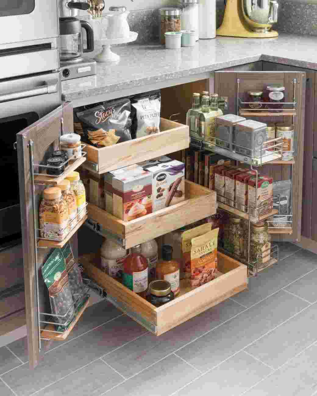Когда вы думаете, что ваши кухонные шкафы полностью заполнены, и они не могут вместить ваши вещи, рассмотрите их нижнюю сторону! Вы можете добавить крючки на дно, чтобы держать кружки и небольшие инструменты. Или используйте магнитные полосы, чтобы сделать плавающую стойку для специй.