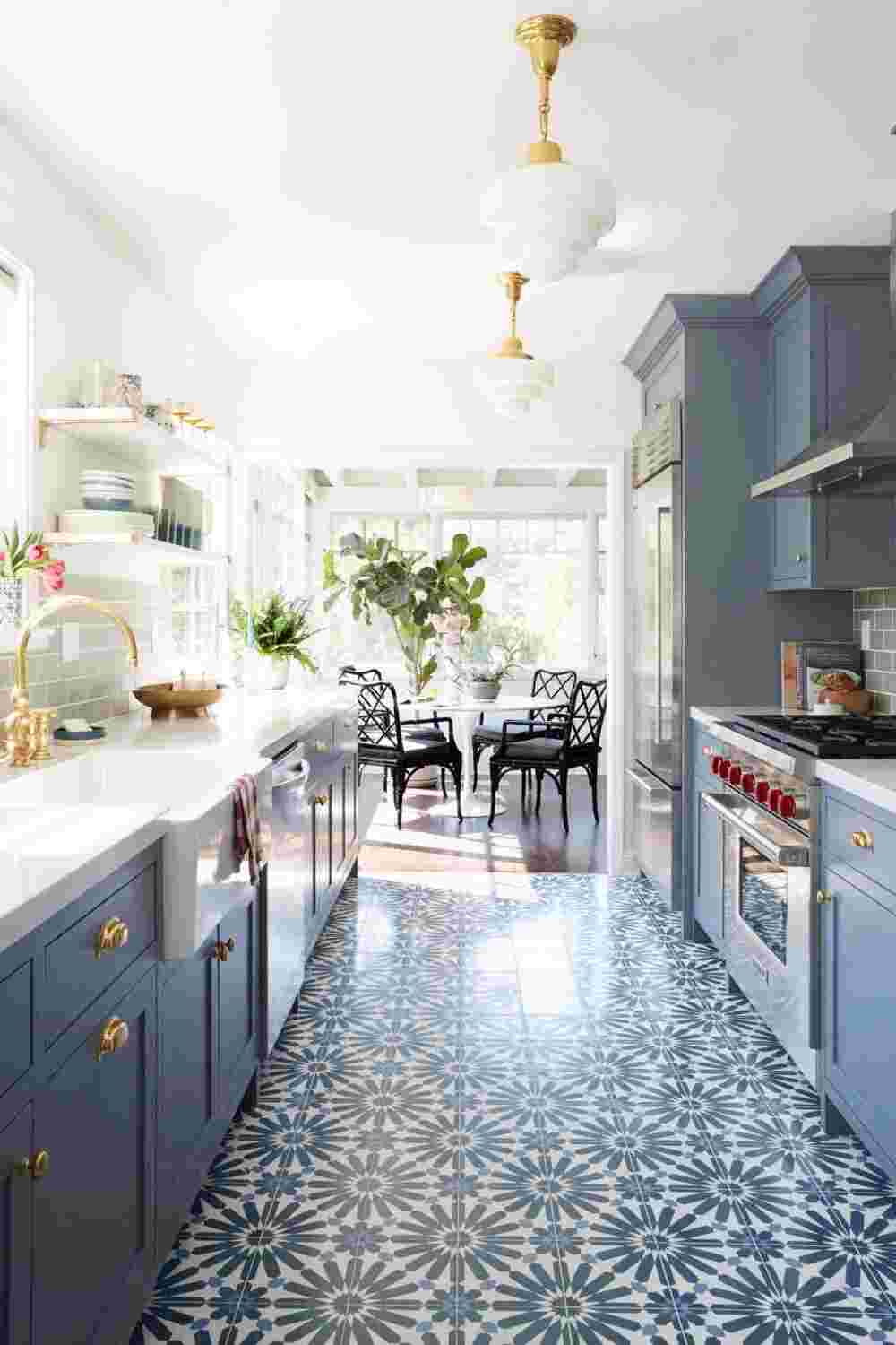 Этот участок больше всего подвержен загрязнениям и нагрузками. Многие современные напольные покрытия имеют хорошие эксплуатационные характеристики, но для кухонного пола наилучшим покрытием будет плитка или керамогранит, прочные, позволяющие быстро и легко проводить влажную уборку.