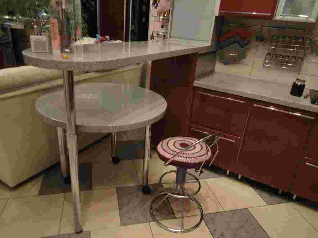 Обеденный стол со стульями отнимает немало места на кухне. Отказаться от него полностью не всегда возможно, однако есть способ решить данную проблему — вместо стола можно использовать барную стойку, которая, благодаря своим компактным размерам, легко впишется в любое пространство. Такая стойка может быть выдвижной, либо стационарной.