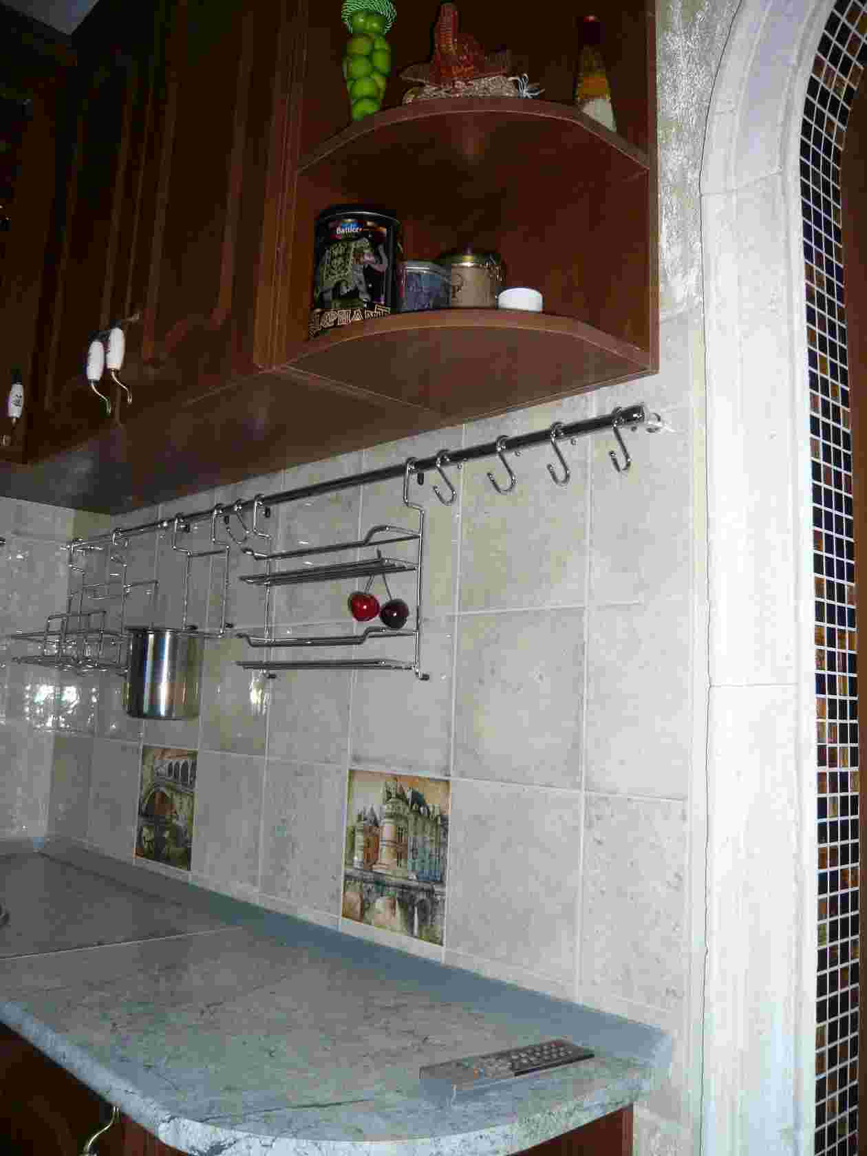 Металлические рейлинги также помогают решить проблему небольшой кухни. Установить их можно прямо на кухонном фартуке. Рейлинги отличаются высокой функциональностью, они практически не занимают места и помогают держать под рукой все необходимые кухонные аксессуары — прихватки, половники, лопатки, бумажные полотенца, баночки со специями, и многое другое.