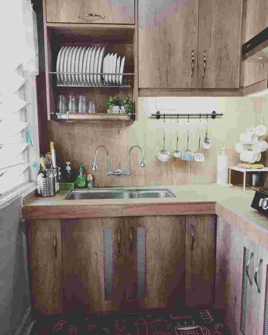Если у вас нет вытяжки, вы можете использовать это пространство на стене, повесив дополнительные полки для своей кухонной утвари, так и для более крупной посуды. Если у вас есть шкафы, которые не упираются в стену, то вас есть несколько десятков дополнительного места для хранения. Это правда! Вы можете сделать выдвижной ящик, добавить полки и многое другое. Очень удобный вариант!