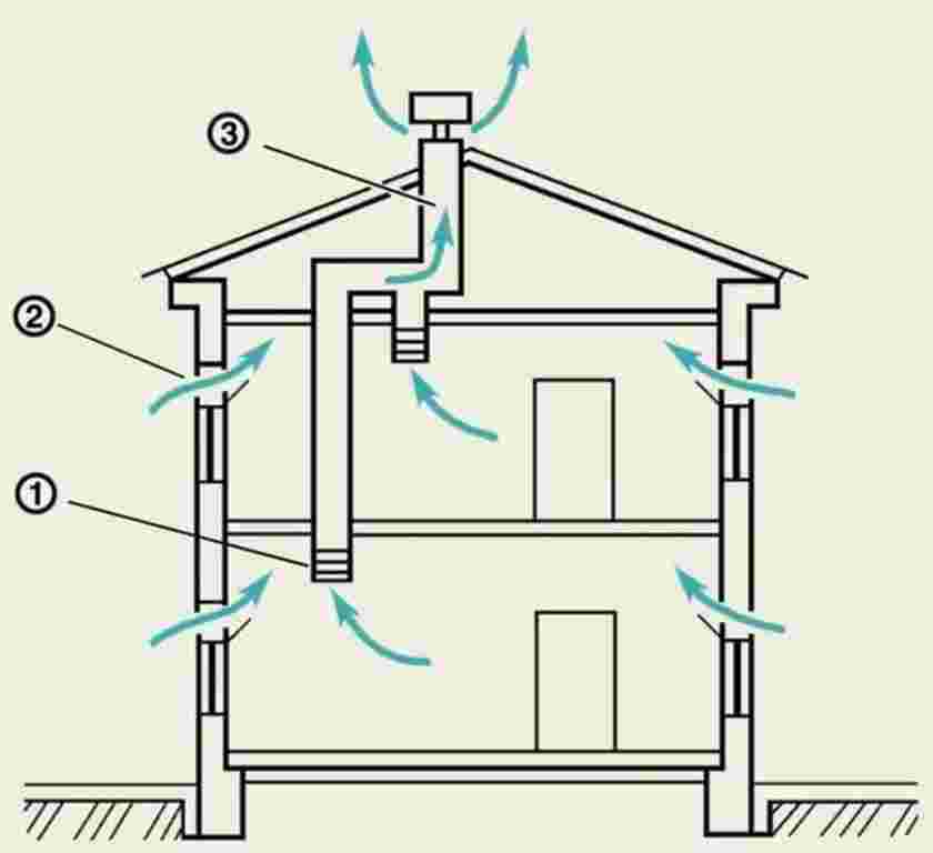 Схема естественной вентсистемы в частных домах немного отличается от квартирной. Приток тоже осуществляется через окна и/или клапана. А вот вентиляционные шахты в коттеджах ставятся нечасто (разве что это здание в несколько этажей и с погребом).