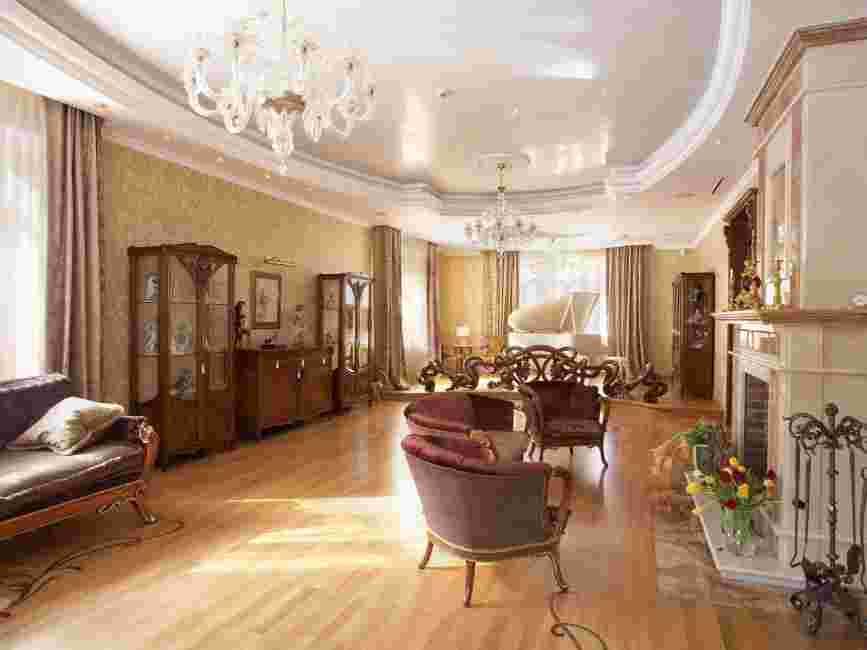 Потолок одновременно нейтральный и привлекающий внимание. То есть, светлый (желательно теплый белый) цвет разбавляется богатым декором с растительным узором, витражами, громоздкими светильниками, лепниной