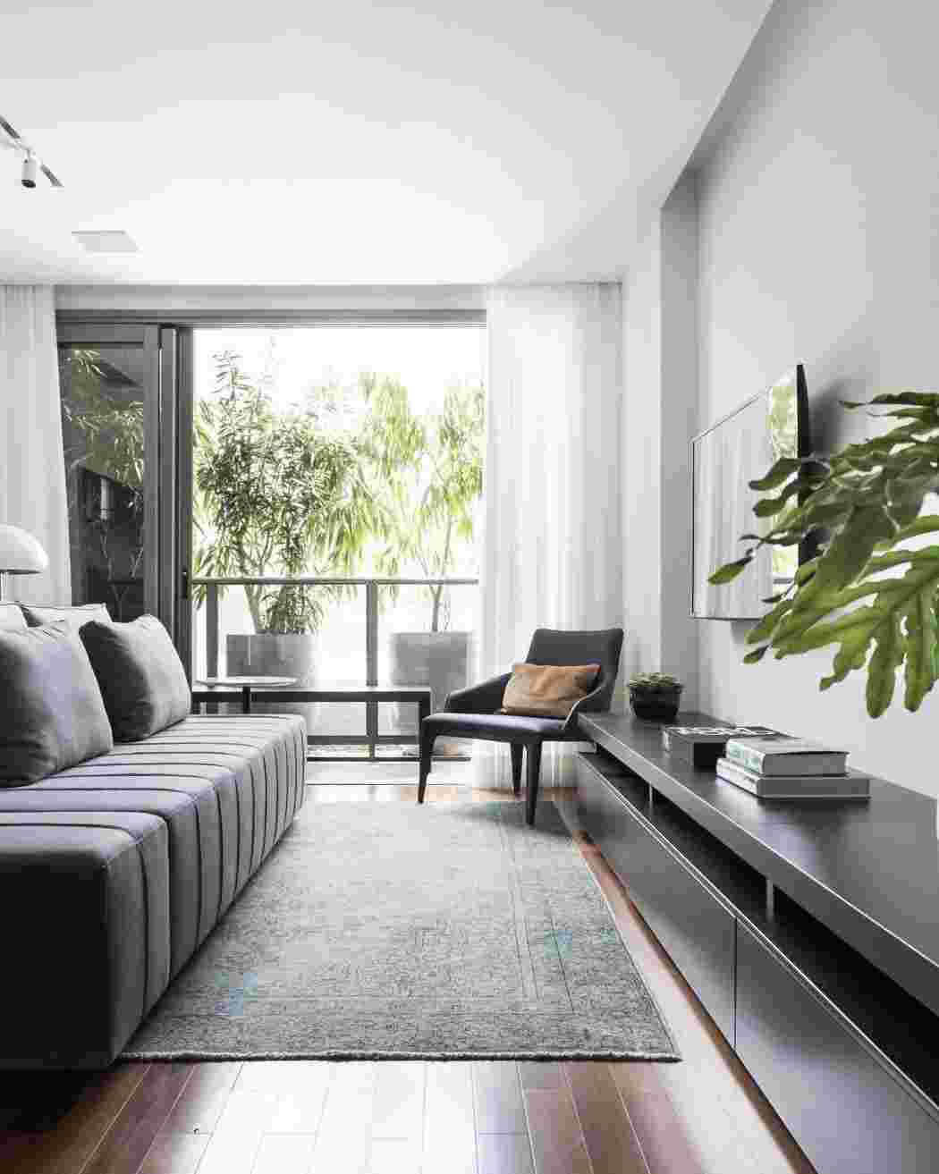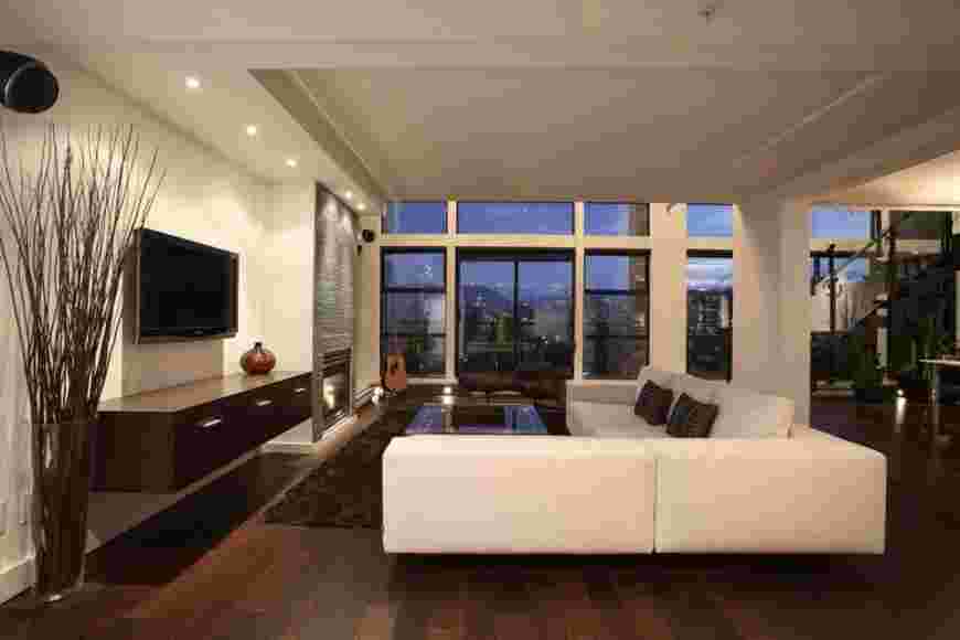 Минимализм в интерьере созвучно объединяет большое пространство, холодные формы и функциональность. Грамотная установка осветительных приборов является главным элементом гостиной. Комната зрительно станет больше при наличии больших окон, обеспечивающих свободный доступ света. Телевизор предпочтительно закрепить на стене