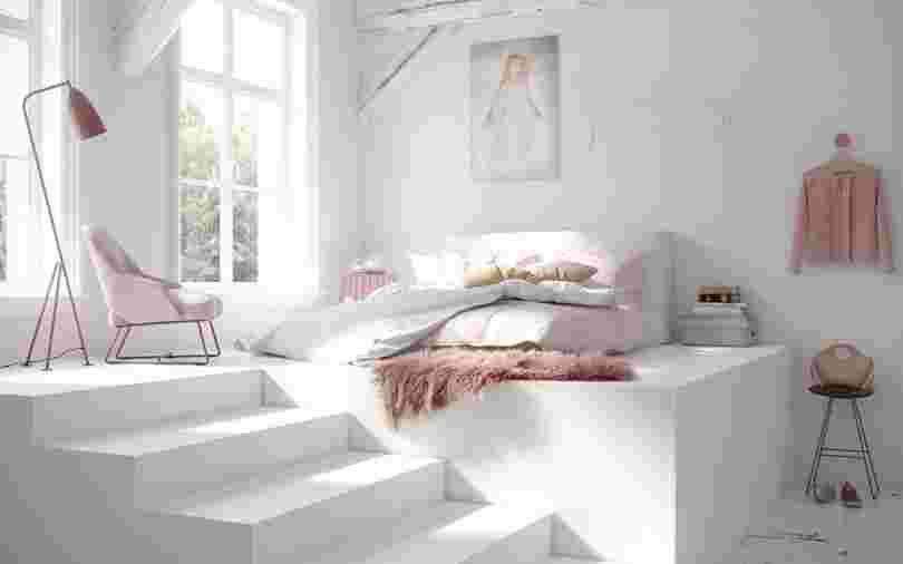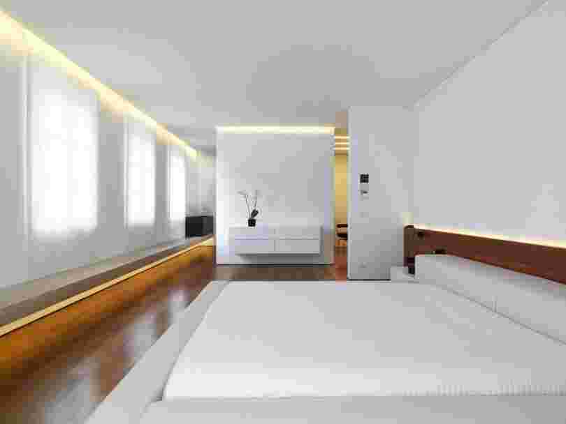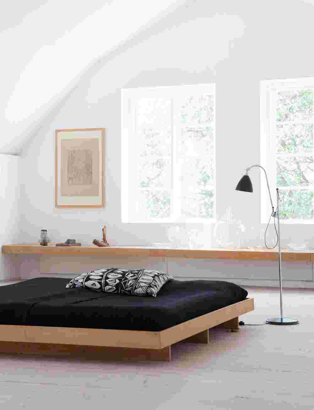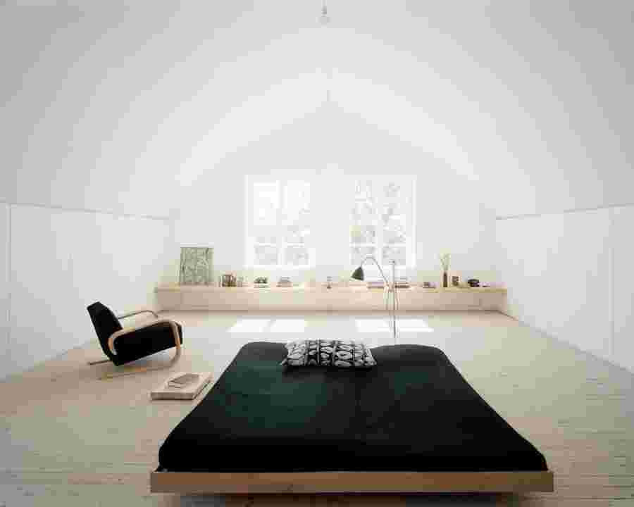 Спальня в минималистическом стиле – бесподобна. Функциональность требует, чтобы это было царство сна и все дизайнерские решения подчинены этой цели. Главный герой – низкая, широкая кровать на платформе.