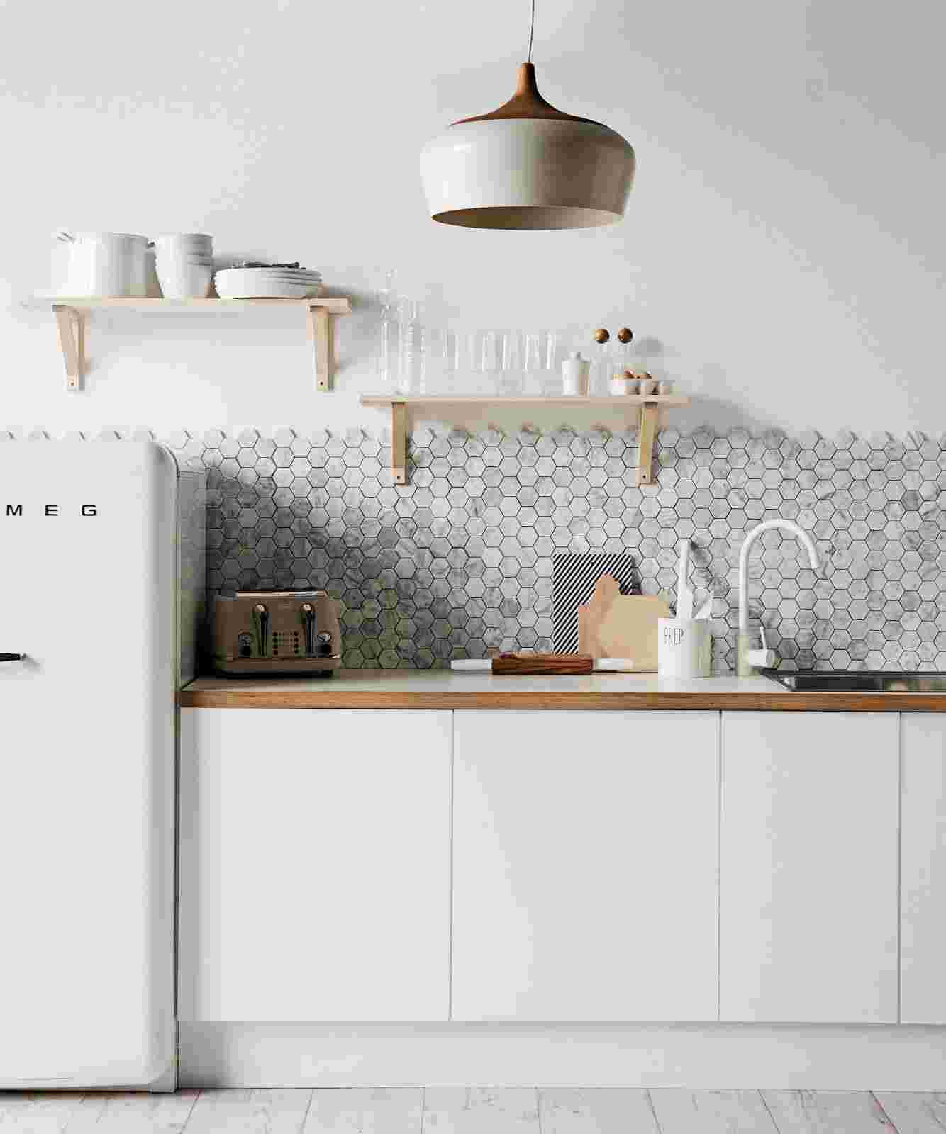 - кухонный фартук – делается из плитки, матового стекла или деревянных панелей без ярко выраженного рисунка и фактуры, сочетается по тону со стенами или столешницей, но может отличается от стен на тон, становясь акцентным элементом;