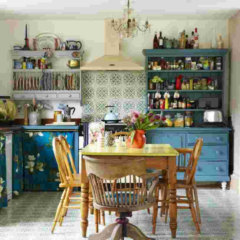 - аксессуары играют важнейшую роль и должны вносить уют и душевность. Используется эмалированная посуда, вязаные салфетки, льняные занавески, цветы, зеркала в простых рамах, присутствует обилие текстиля (ситец, лен, хлопок). Преобладающие рисунки: клетка, полоска, горошек.