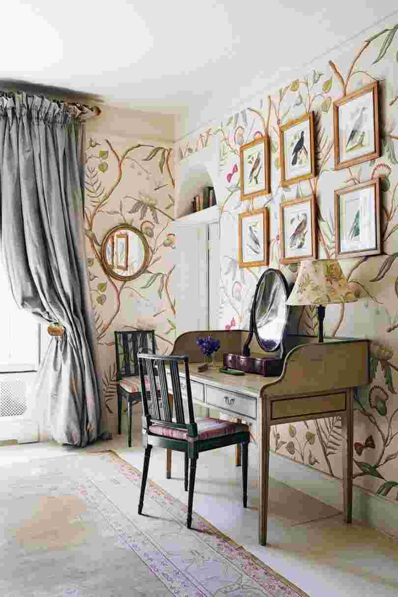Винтажные стены декорируют обоями с цветами или птицами и деревьями. Возможен вариант с обоями, окрашенными в один оттенок, а также использование кирпича.