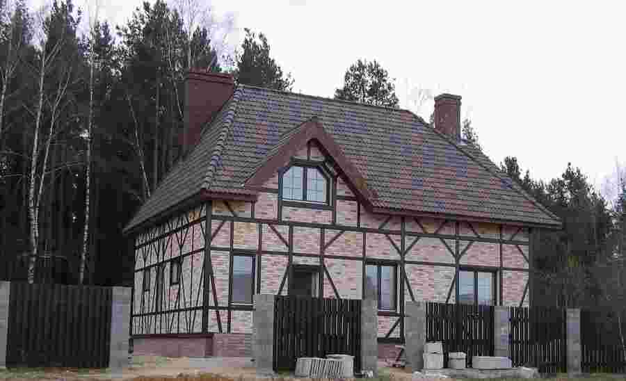- фасад облицовывается камнем, кирпичом, реже — штукатуркой. Для удешевления строительства используют искусственные материалы, хорошо имитирующие натуральные;