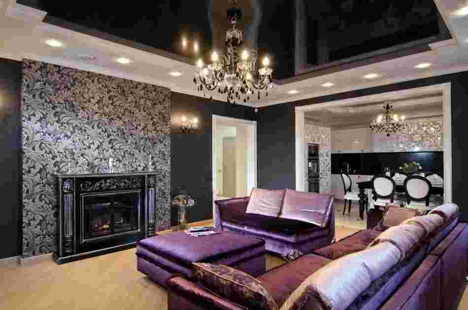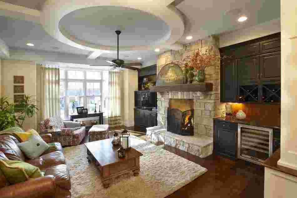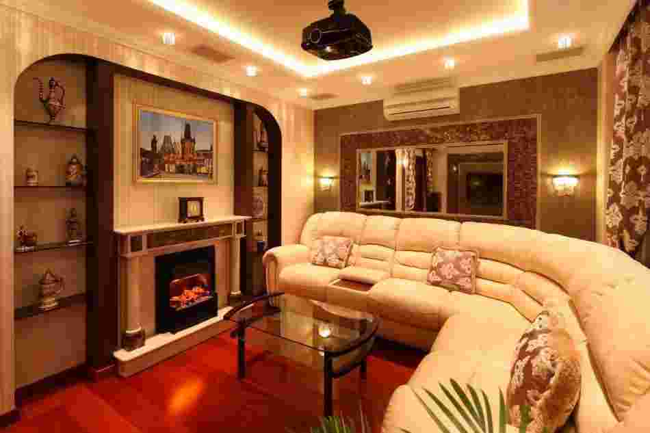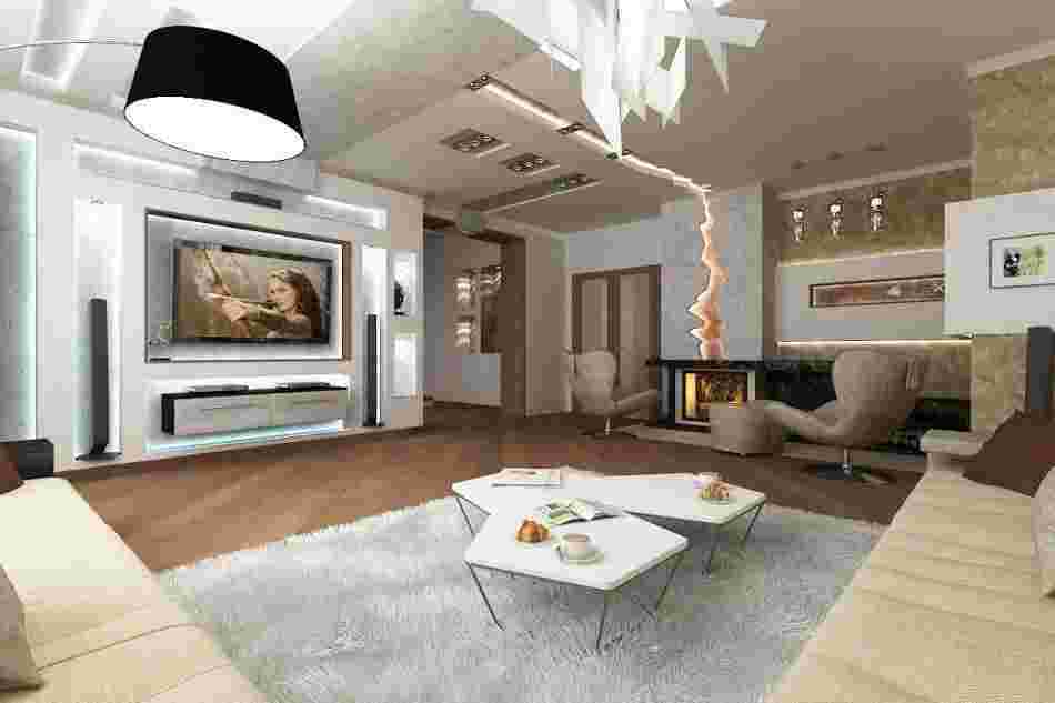Удачным решением будет в центре просторного зала камин. Его и столы можно эффектно украсить лепниной, можно оформить мрамором или другими материалами. Горящий камин мгновенно создаст домашний комфорт и уютную атмосферу в интерьере гостиной модерн. Камины – показатель отличного вкуса не только в модерне, но и в других дизайнах.