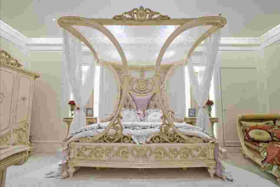 Центральное освещение предполагает дорогую люстру с цветочными мотивами, украшенную хрустальными подвесками. Иногда ее замещают светящиеся витражи, расположенные по центру или сразу в нескольких потолочных зонах. Для мягкого рассеянного света используют классические бра, гармонирующие с люстрой. На прикроватных тумбах устанавливают мини-торшеры.