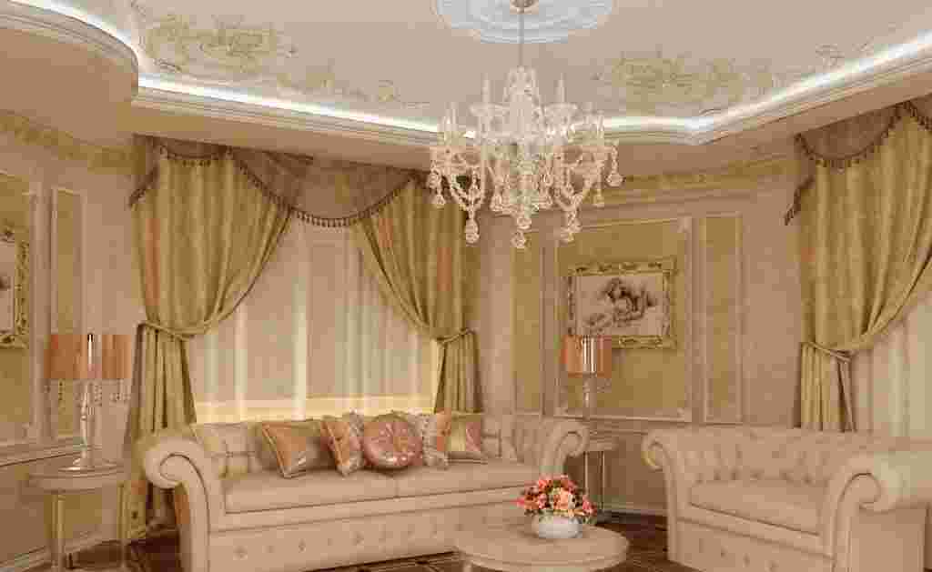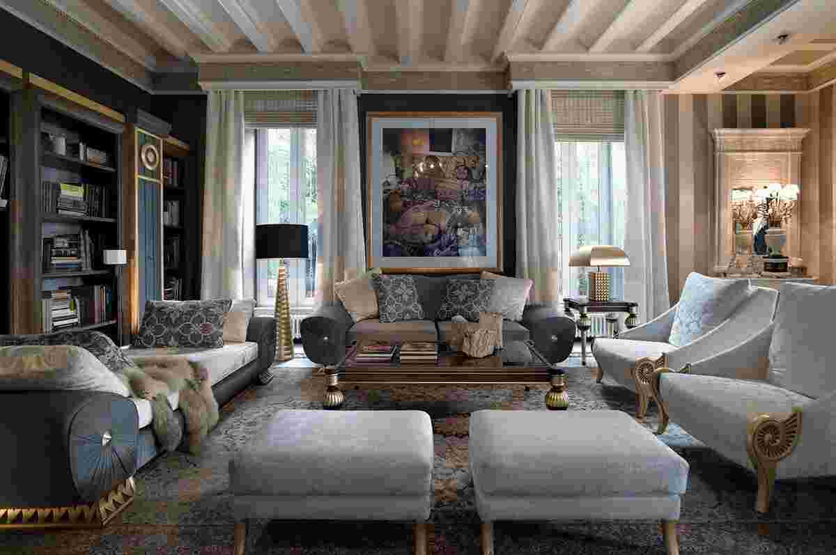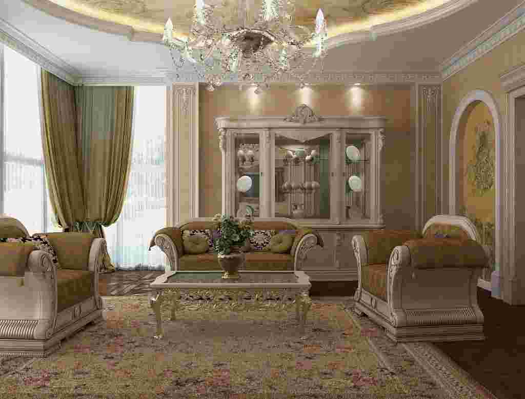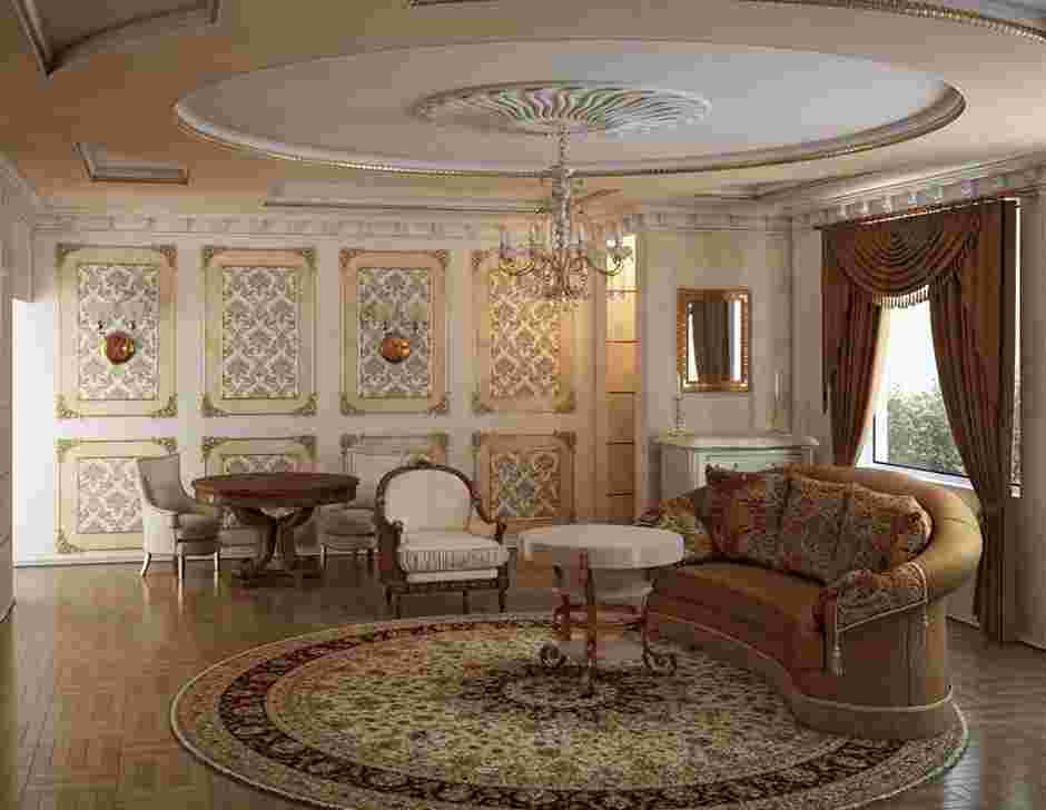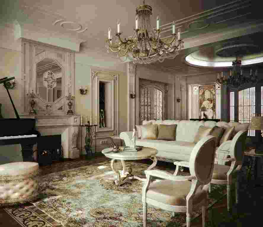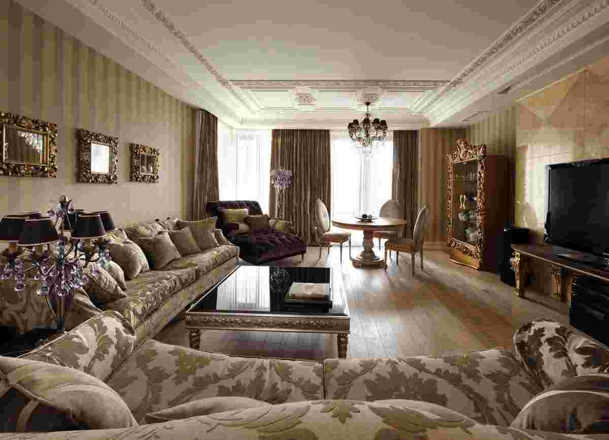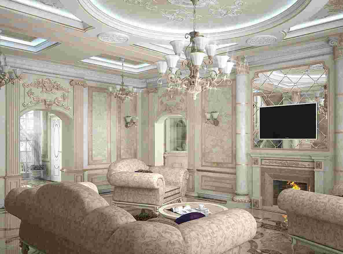 В оформлении комнаты используют элементы классицизма, барокко, рококо, ампира и следуют традиционным канонам. В проектах гостиных присутствуют и современные элементы. Но они всегда упорядочены и логично вписаны.