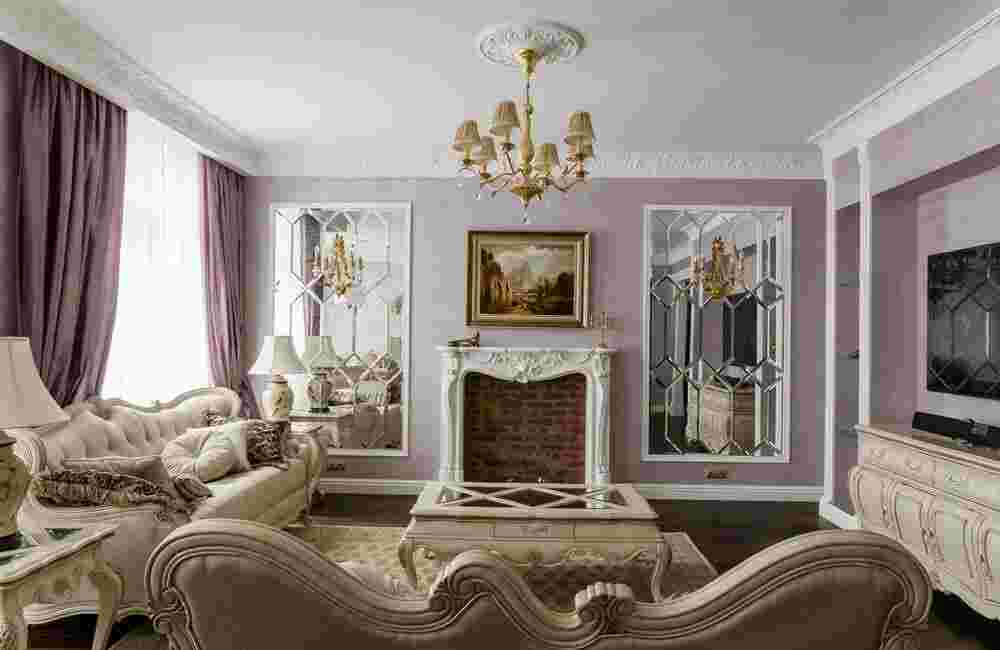 Великолепная стилистика рококо подчеркивается элегантным зеркалом в золоченой раме и белым массивным камином.