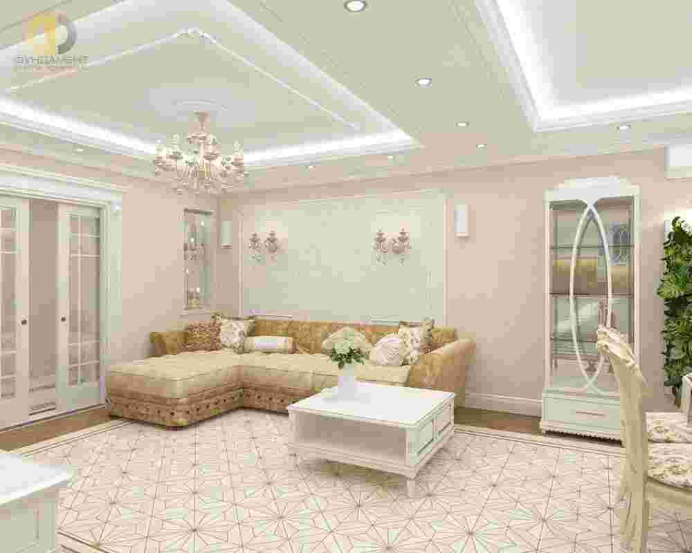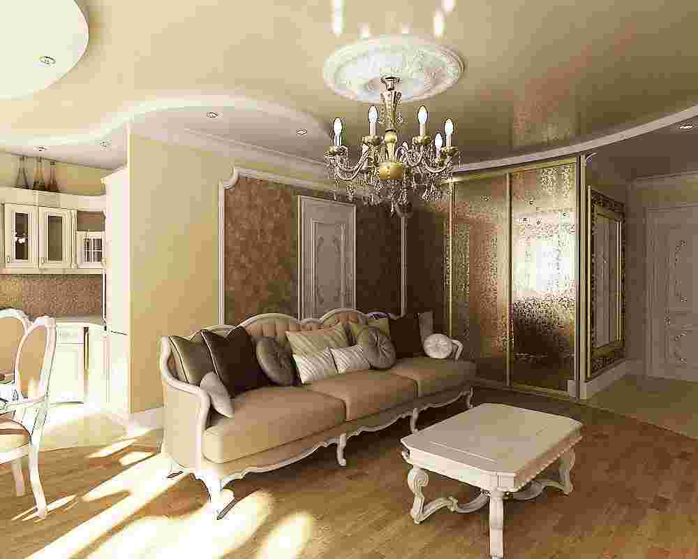 Светло-бежевые и песочные оттенки в гостиной 19 кв. м не сдавливают пространство. Лепнина и огромная люстра с имитацией свечей уравновешены миниатюрным журнальным столиком и светлым ковром с золотым узором.