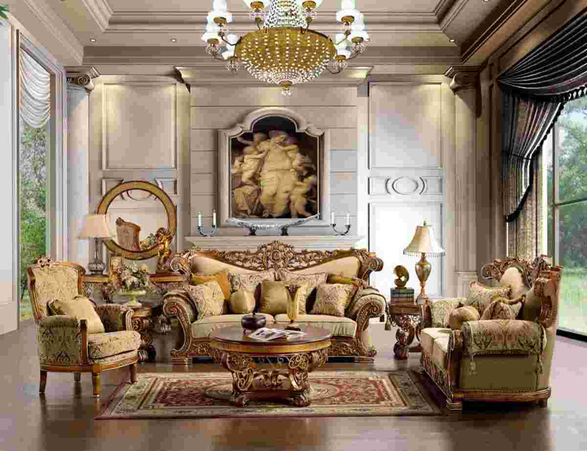Королевский интерьер с обилием золота, темной мебелью завершает выбор богатой обивки для мягкого гарнитура.