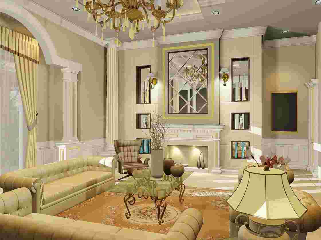 Шикарные комнаты среднего размера можно оформить в стиле классика следующим образом: в центре помещения обустраивается диванная зона с диваном и креслами, а посередине ставится журнальный столик. Лучше, если он будет иметь стеклянную столешницу. Посередине одной из боковых стен лучше расположить камин и дополнить его мягкими источниками освещения.