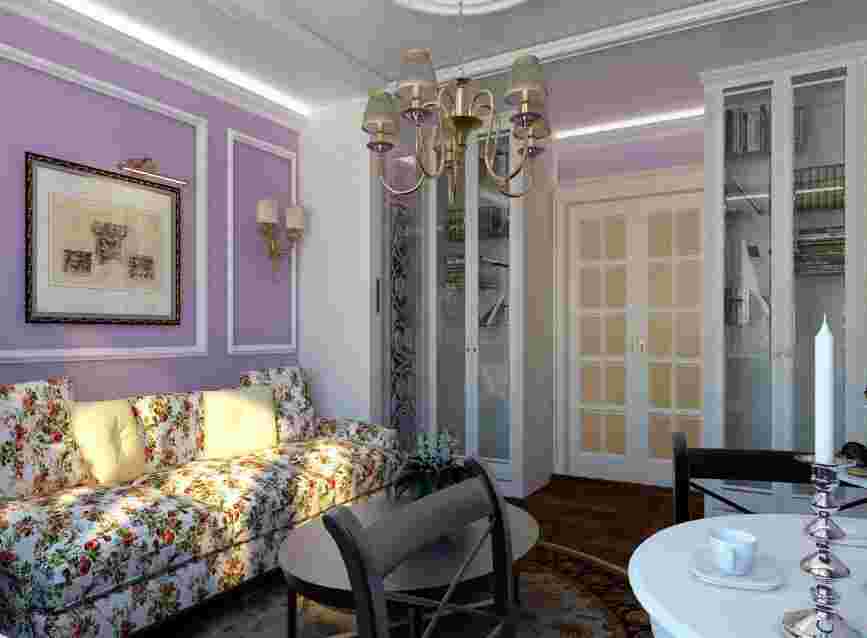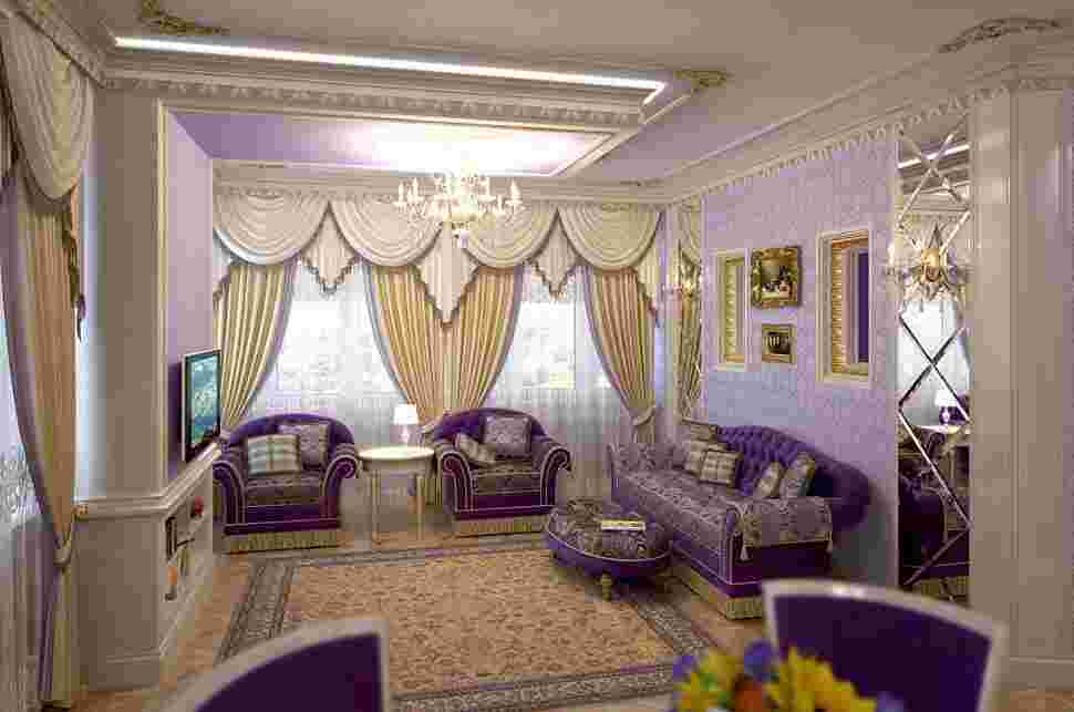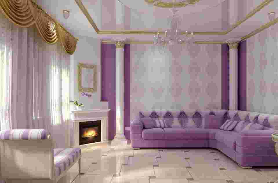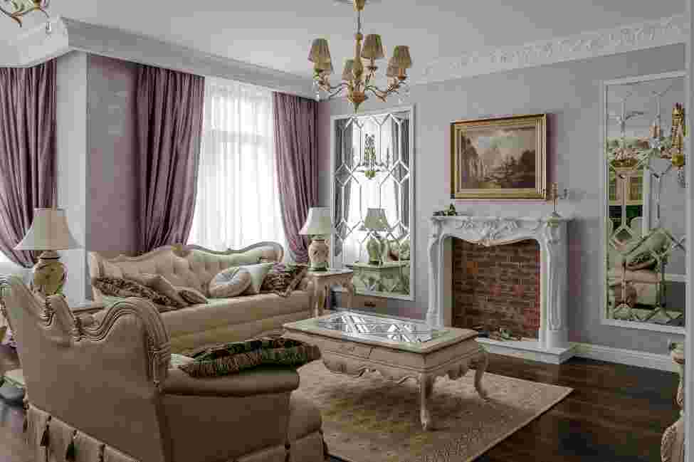 На фото сиренево-бежевое и белое сочетание цветов в гостиной в классическом стиле.