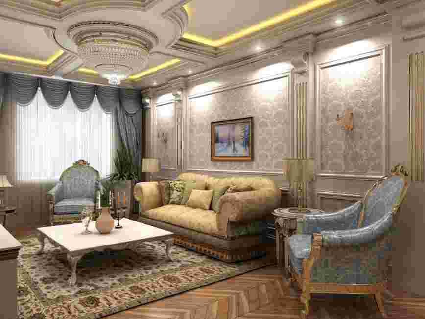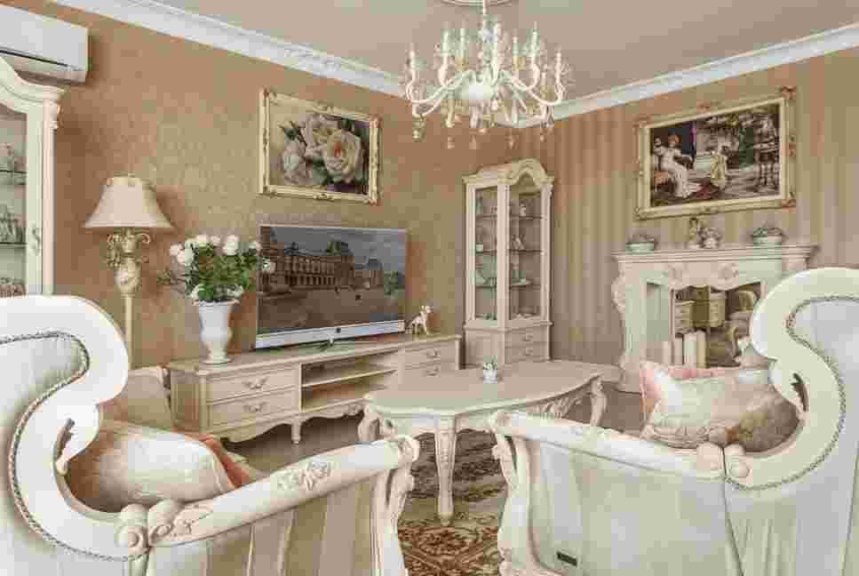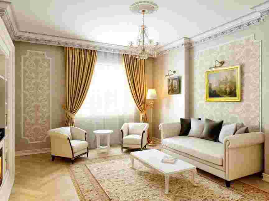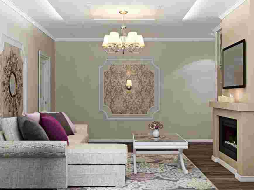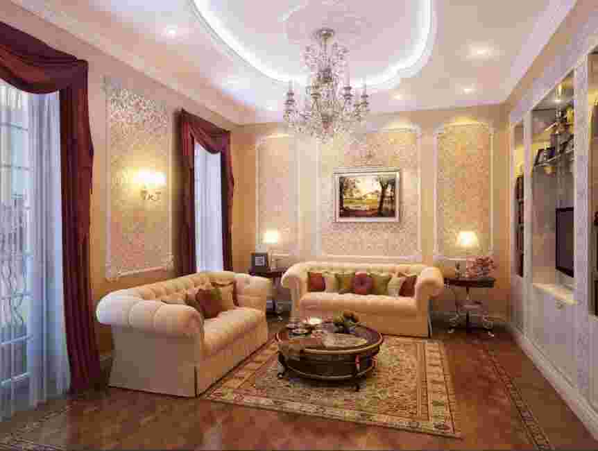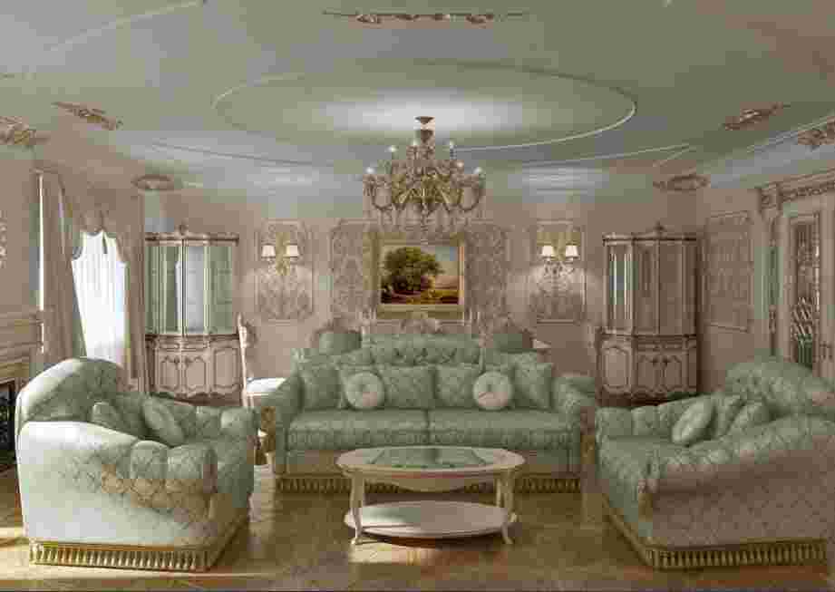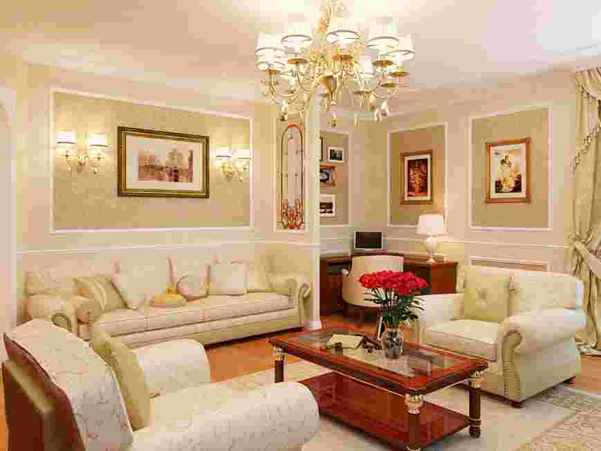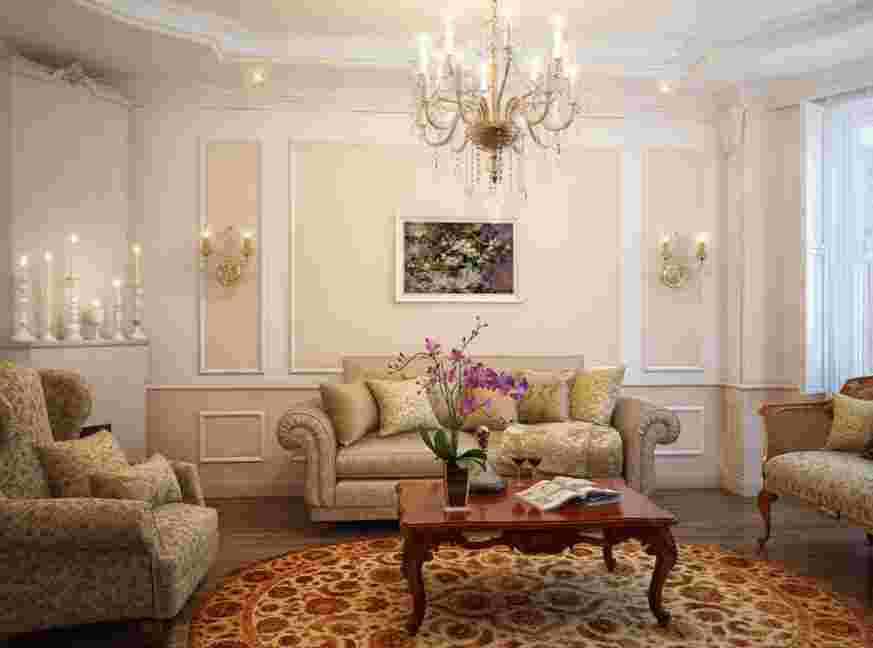 Помимо стандартного белого цвета, гостиную в классическом стиле выдерживают в нейтральных пудровых, голубых, розоватых или фисташковых тонах. Применяют бежевые, песочные и карамельные колеры, относящиеся к теплому спектру.
