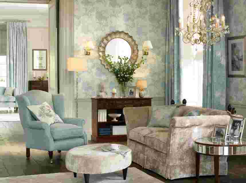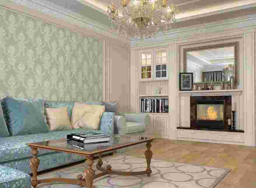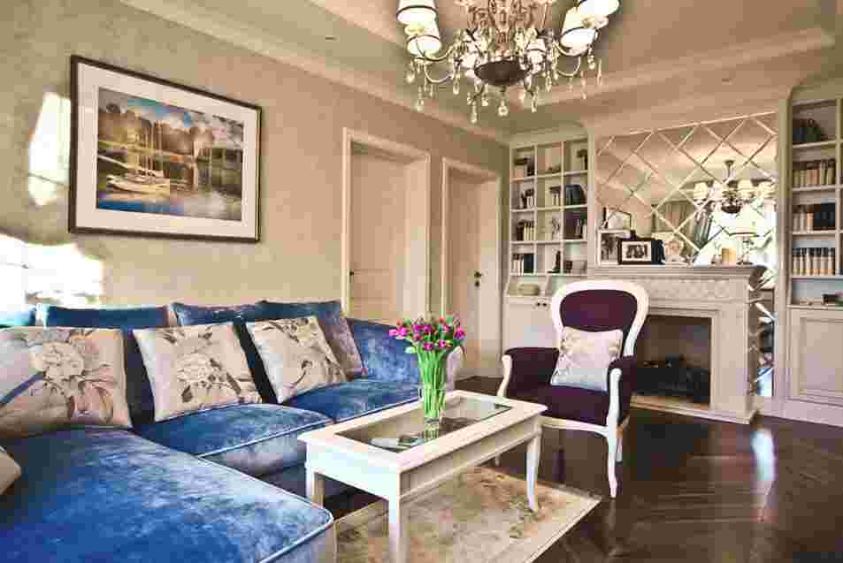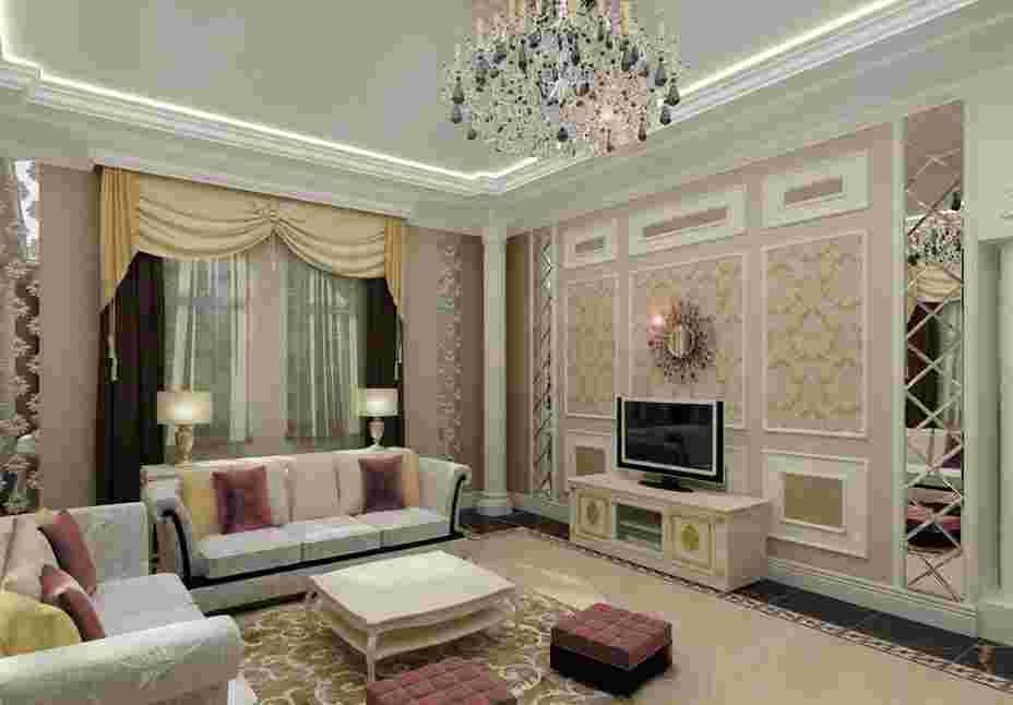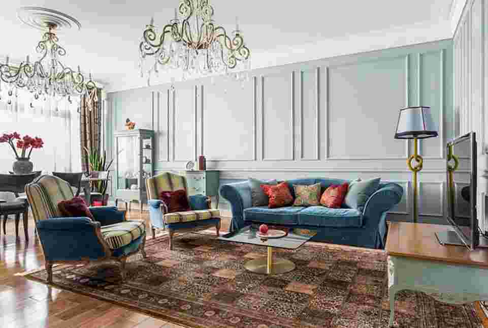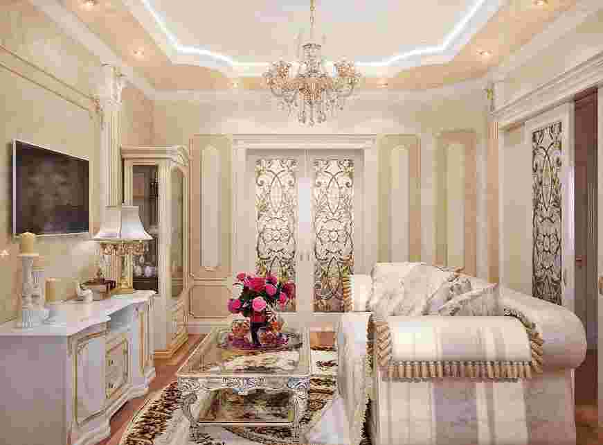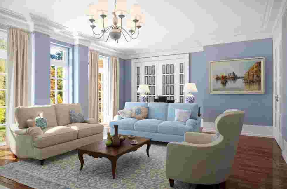 Помимо стандартного белого цвета, гостиную в классическом стиле выдерживают в нейтральных пудровых, голубых, розоватых или фисташковых тонах. Применяют бежевые, песочные и карамельные колеры, относящиеся к теплому спектру.