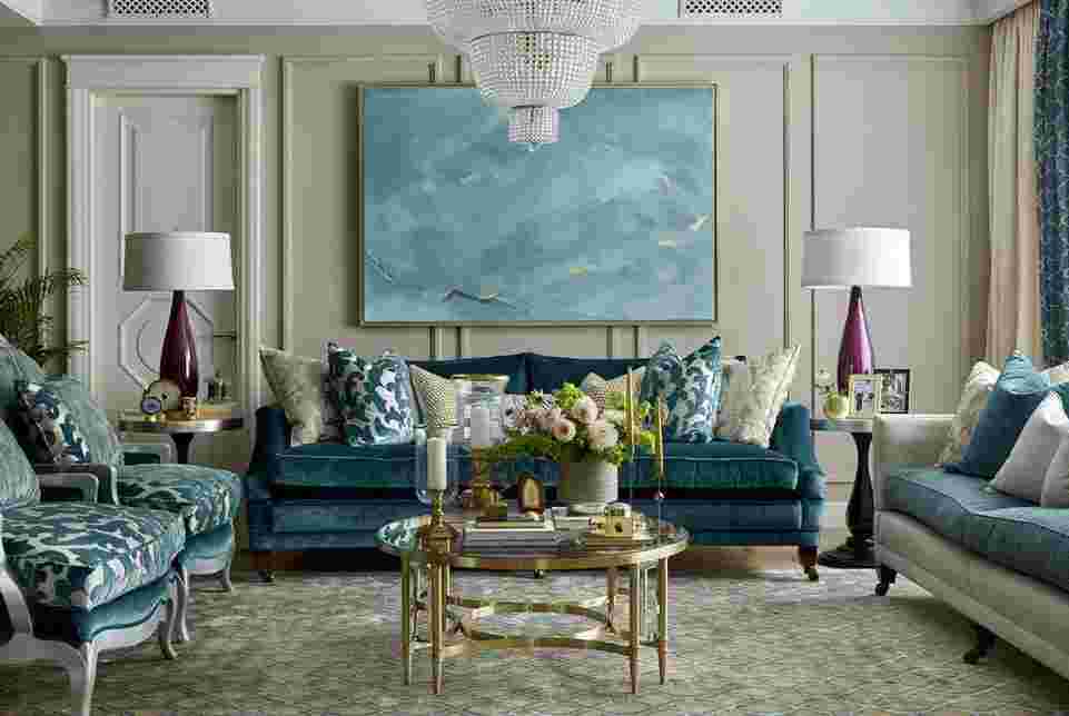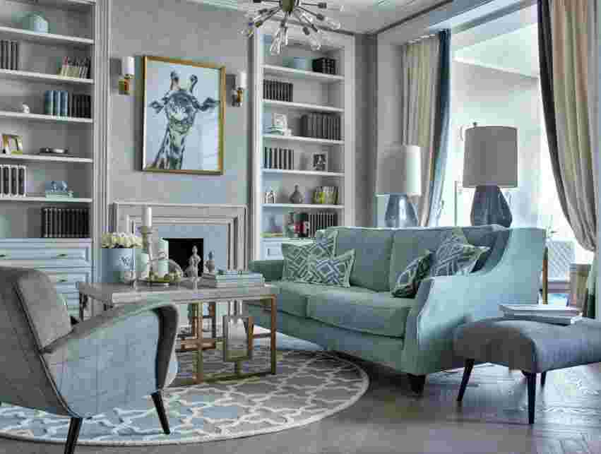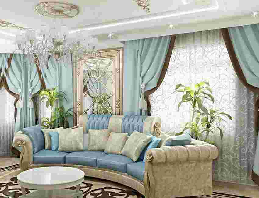 На фото зал в классическом стиле с мягкой мебелью бирюзового цвета.