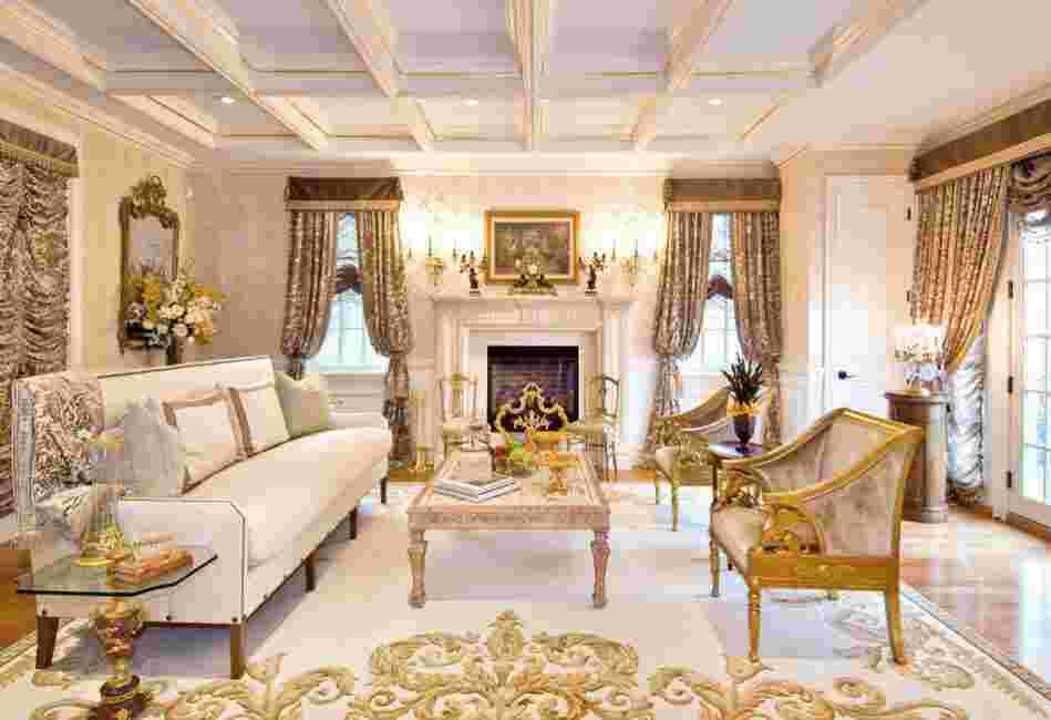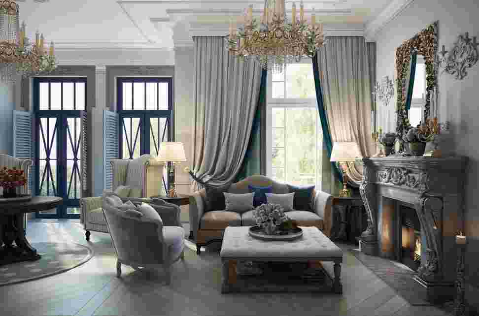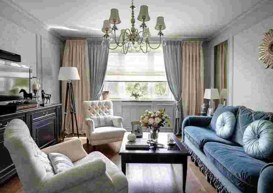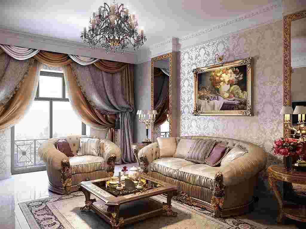 Интерьеры классического типа, в том числе гостиные, немыслимы без аксессуаров. Все они изящны, желательно с чертами «прошлого» (уместны витиеватые контуры, бронзовые и золочёные элементы, полуажурное исполнение в украшениях):