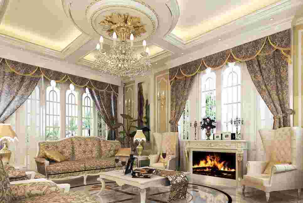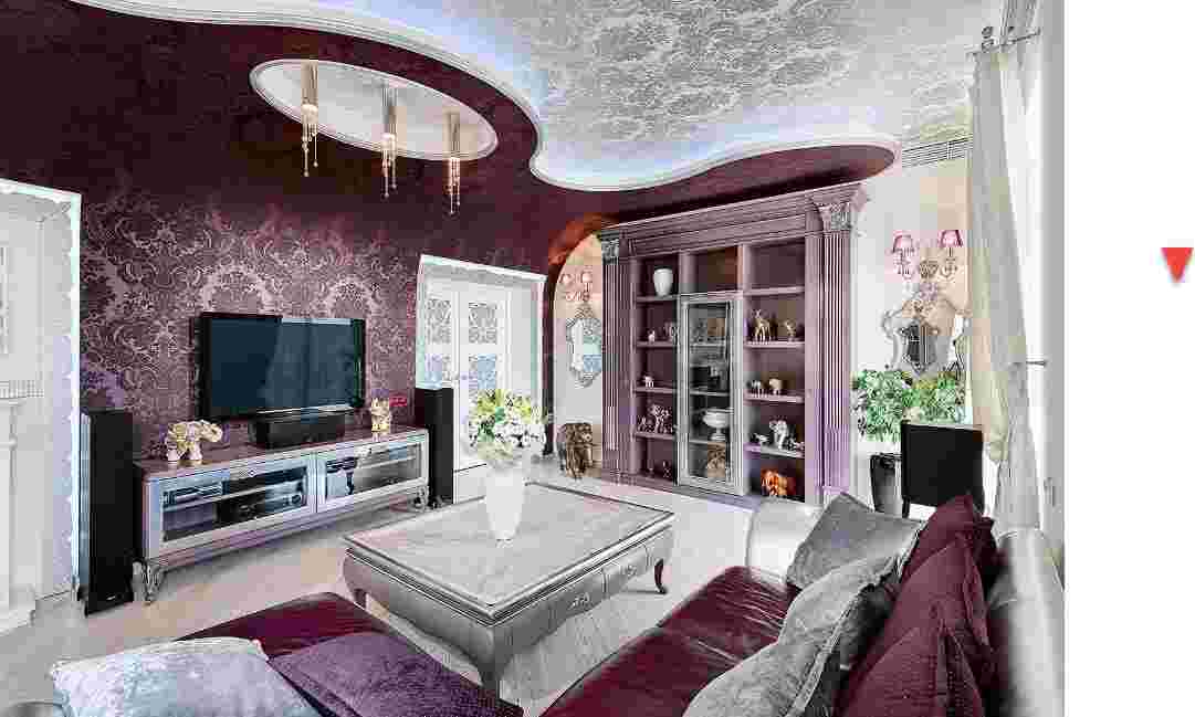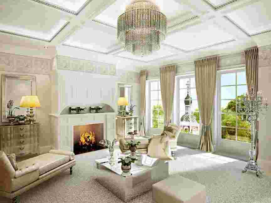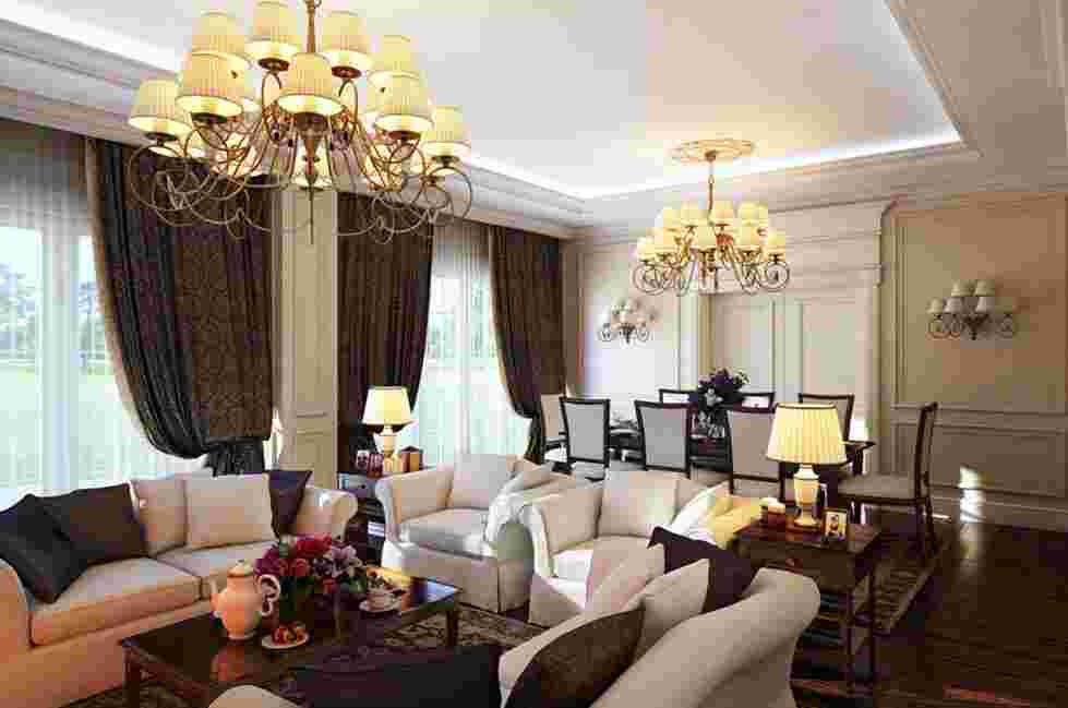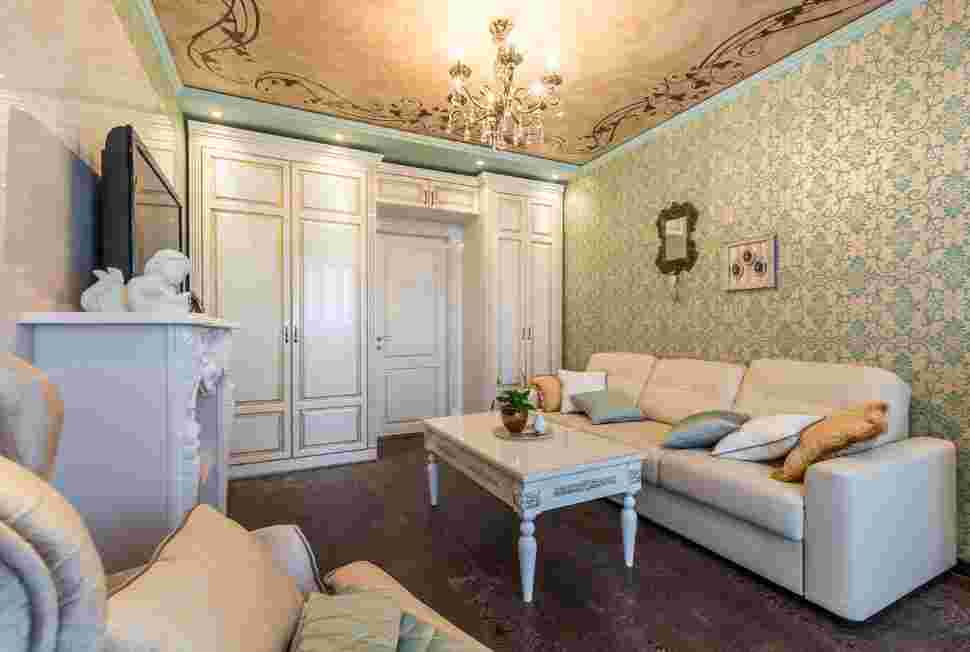 Для ровного потолка подойдет побелка, которую можно декорировать росписью, позолоченной лепниной, фризом и крупными молдингами. В классической гостиной с высоким потолком устанавливают многоуровневые подвесные или натяжные системы с закругленными углами и ромбовидными формами, а также отделывают плоскость деревянными панелями и плитами с объемным узором. Таким образом из обычного потолка получается сделать нестоящее произведение искусства.
