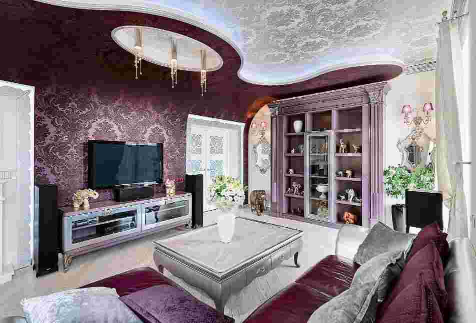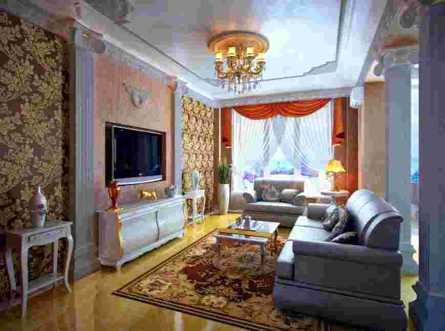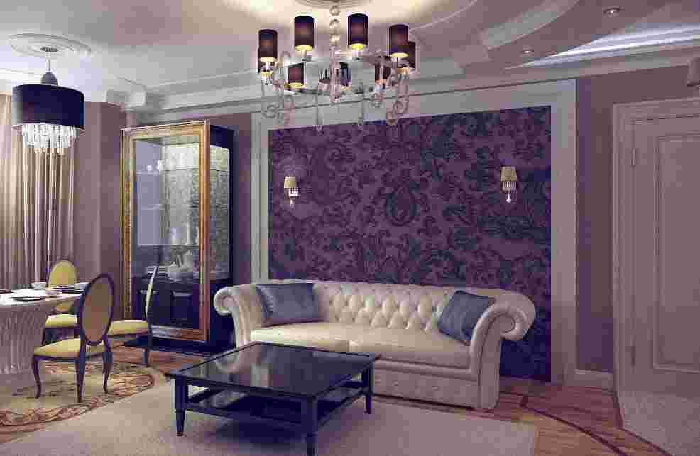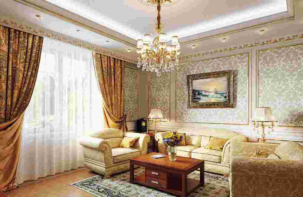 В классической гостиной будут роскошно смотреться темные обои с позолоченным или серебристым орнаментом. Настоящим украшением станут отделочные материалы или меблировка из темного дерева цвета венге или ореха.