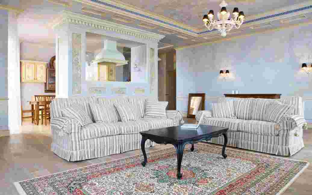 - Знаменитые полосатые диваны с достаточно твердыми сидениями — непременный атрибут оформления помещения в стиле барокко, унаследованные от стилей ампир и рококо. Такие диваны на поверку оказываются не слишком удобными для сидения, однако производят неизгладимое впечатление на всех, кто увидел в реальности настоящий интерьер дома в стиле барокко.