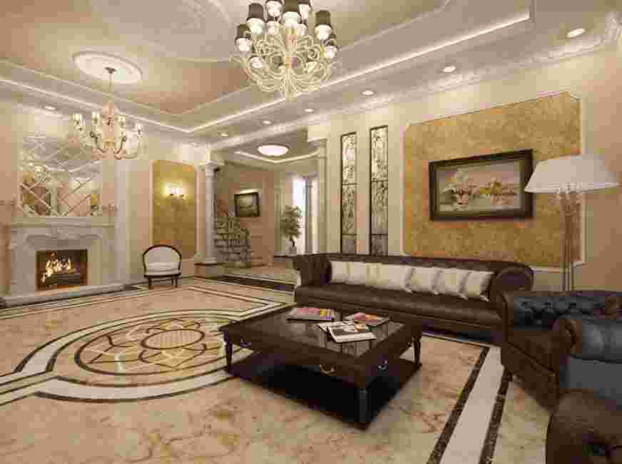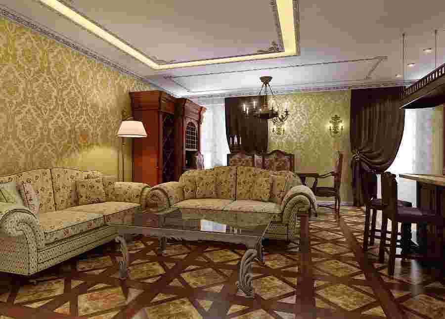 Пол в гостиной выкладывают паркетом с цветочным или геометрическим узором. Чтобы закрепить готовый результат, поверхность покрывают глянцевым лаком. Для отделки также можно использовать ламинат с имитацией натурального деревянного покрытия. Удачным дополнением интерьера в классическом стиле станет пол из благородного мрамора.